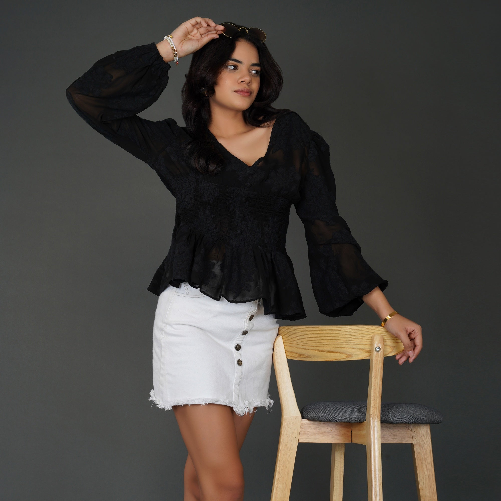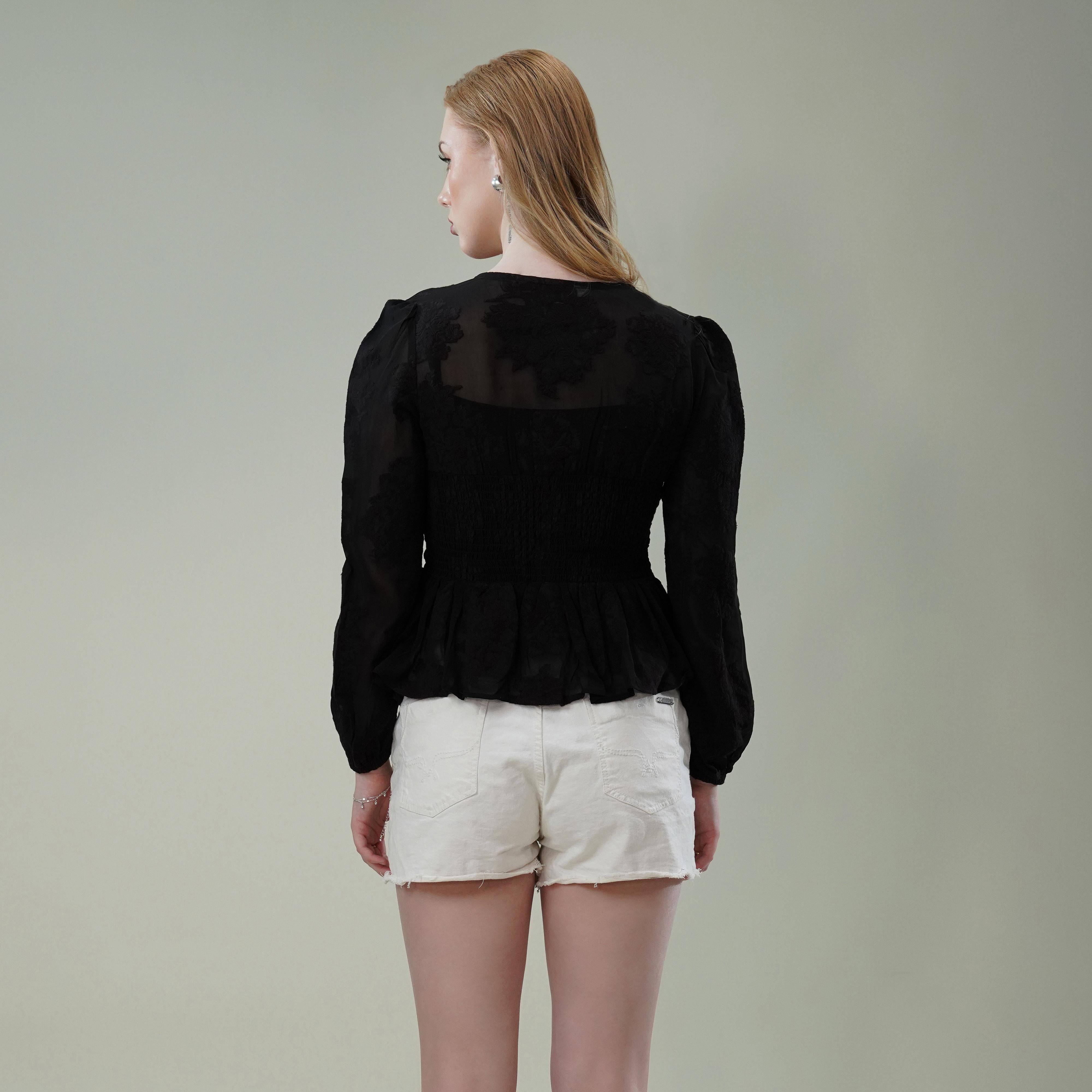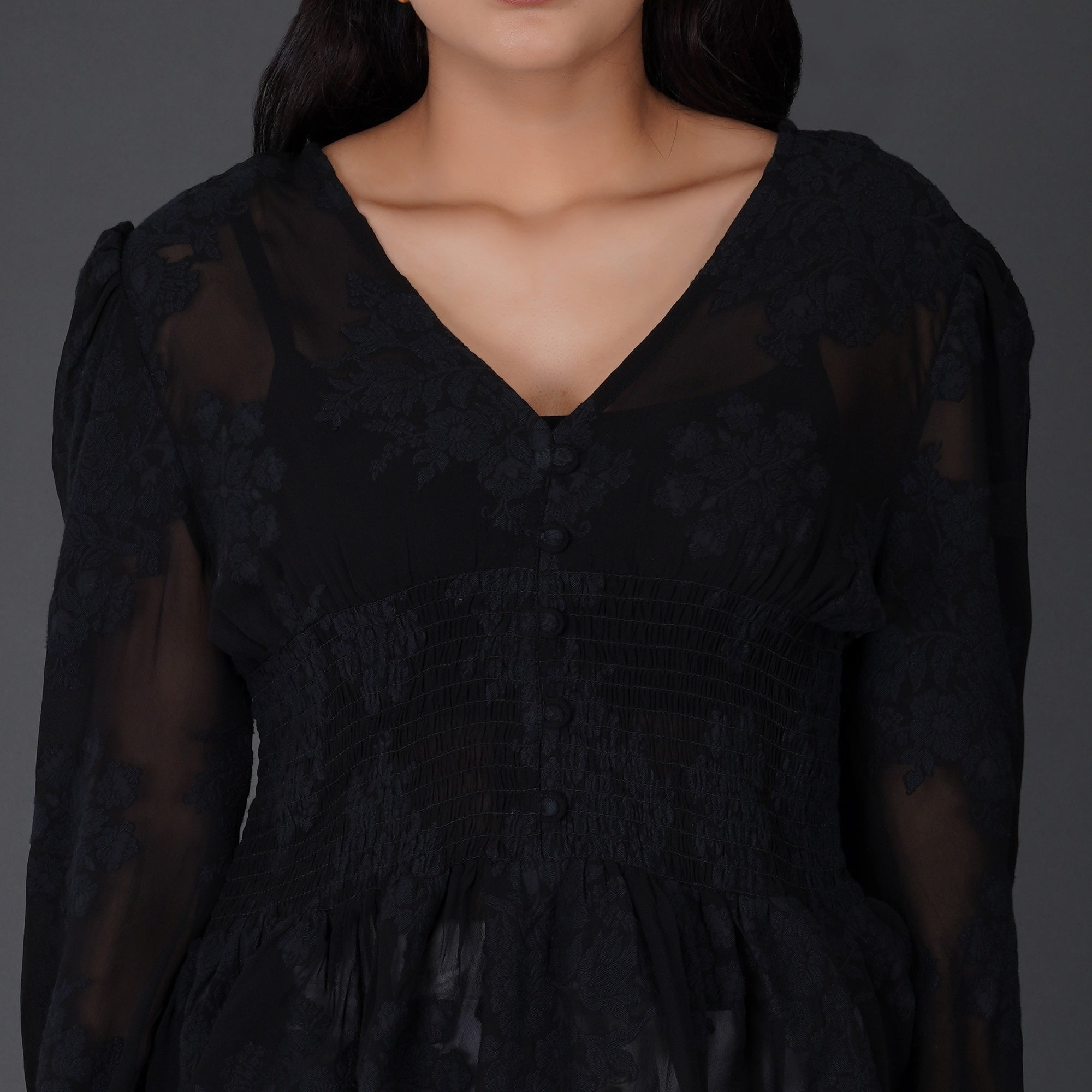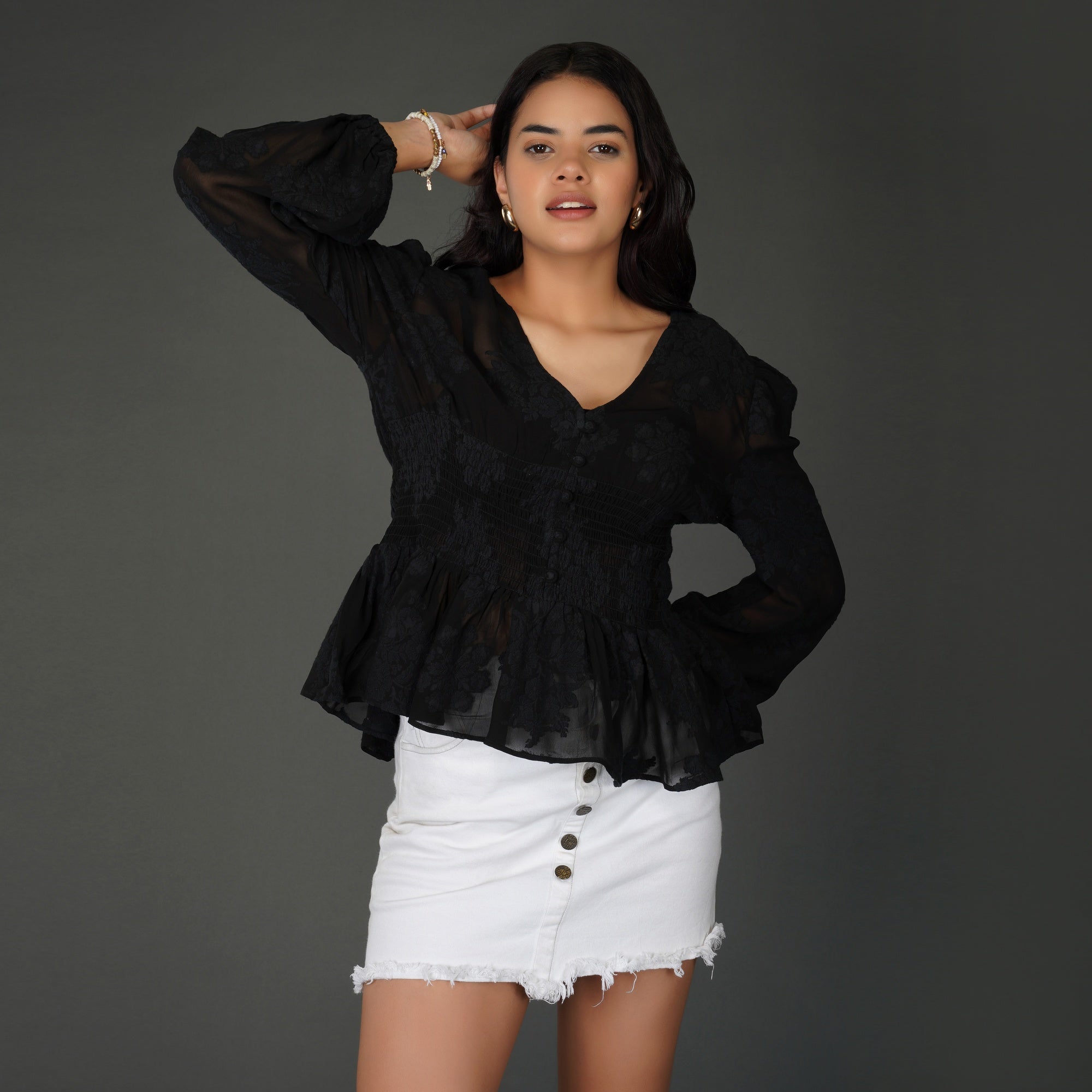PRODUCT DETAILS SPECIFICATIONS Shape: Peplum fit Fit: Regular fit with a cinched waist Length: Hip-length Neck Pattern: V-neckline Sleeve Length: Full Sleeves Sleeve Style: Full-length puff sleeves with elastic cuffs Sheerness: Semi-sheer Pattern: Textured floral georgette top with a smocked waist, sheer puff sleeves, and a flowy peplum hem Material/Fabric: Textured Georgette Care Instructions: Hand wash in cold water with mild detergent, air dry in shade, and iron on low heat with a cloth over the lace Lining Requirement: Yes RECOMMENDATIONS Occasion: Suitable for evening wear, office wear or formal brunches Body Type: Ideal for hourglass and pear shapes Styling: Pair with high-waisted jeans or a sleek skirt and add statement earrings for a chic look SHIPPING AND RETURNS Β Shipping:We deliver across India withΒ free shipping on orders above βΉ1999.Standard shipping charges ofΒ βΉ50-βΉ100Β apply for orders below βΉ1999.Orders are processed withinΒ 1-2 business daysΒ and typically delivered inΒ 2-8 business days, depending on location.Track your order in real-time with the tracking details sent via email/SMS.πΒ Returns & Exchanges:Easy 7-day return policyΒ β return unworn, unwashed items in original packaging.Exchanges availableΒ based on stock availability.Full refund or replacementΒ for damaged or incorrect products (notify us withinΒ 48 hoursΒ of delivery).π¬Β Need Help?Β Contact our support atΒ contact@trumee.inΒ or callΒ +91-8882098526Β (Mon-Sat, 10 AM β 7 PM).