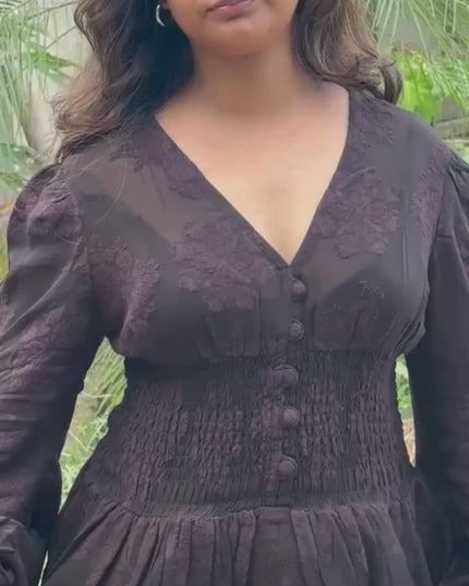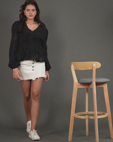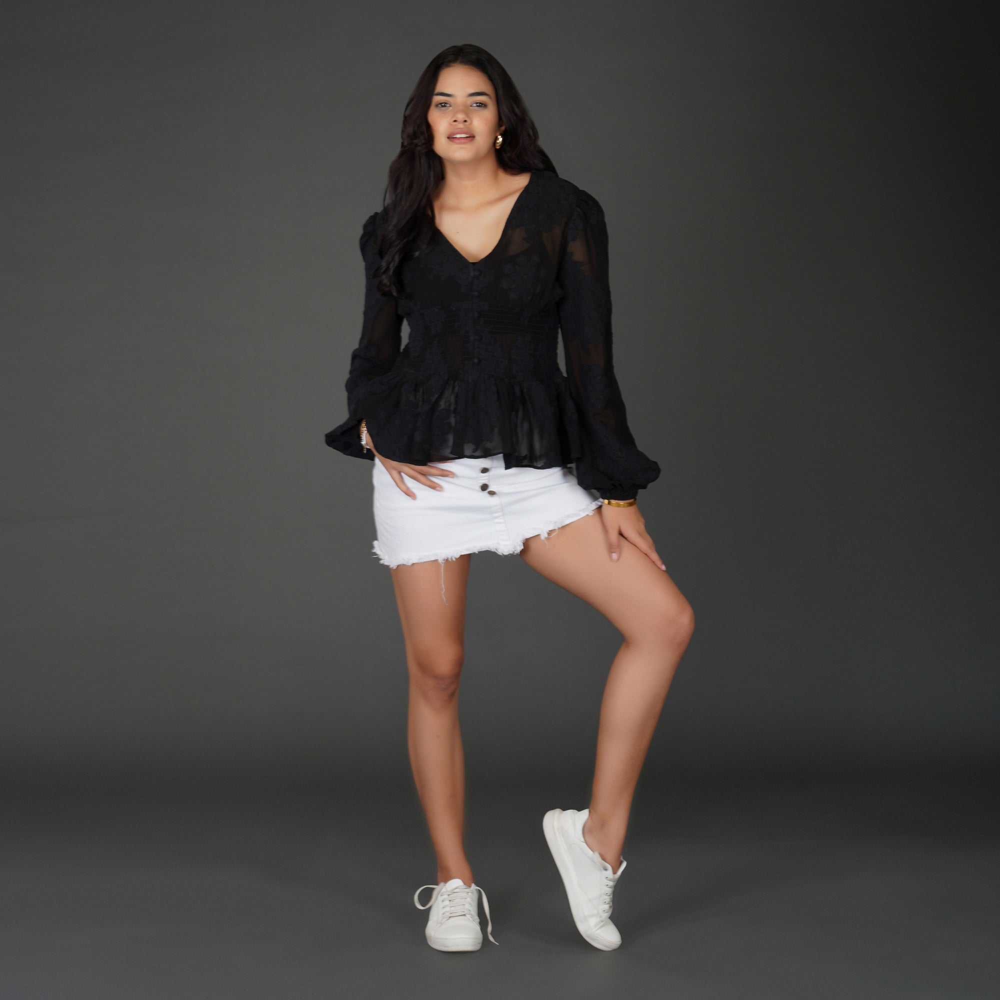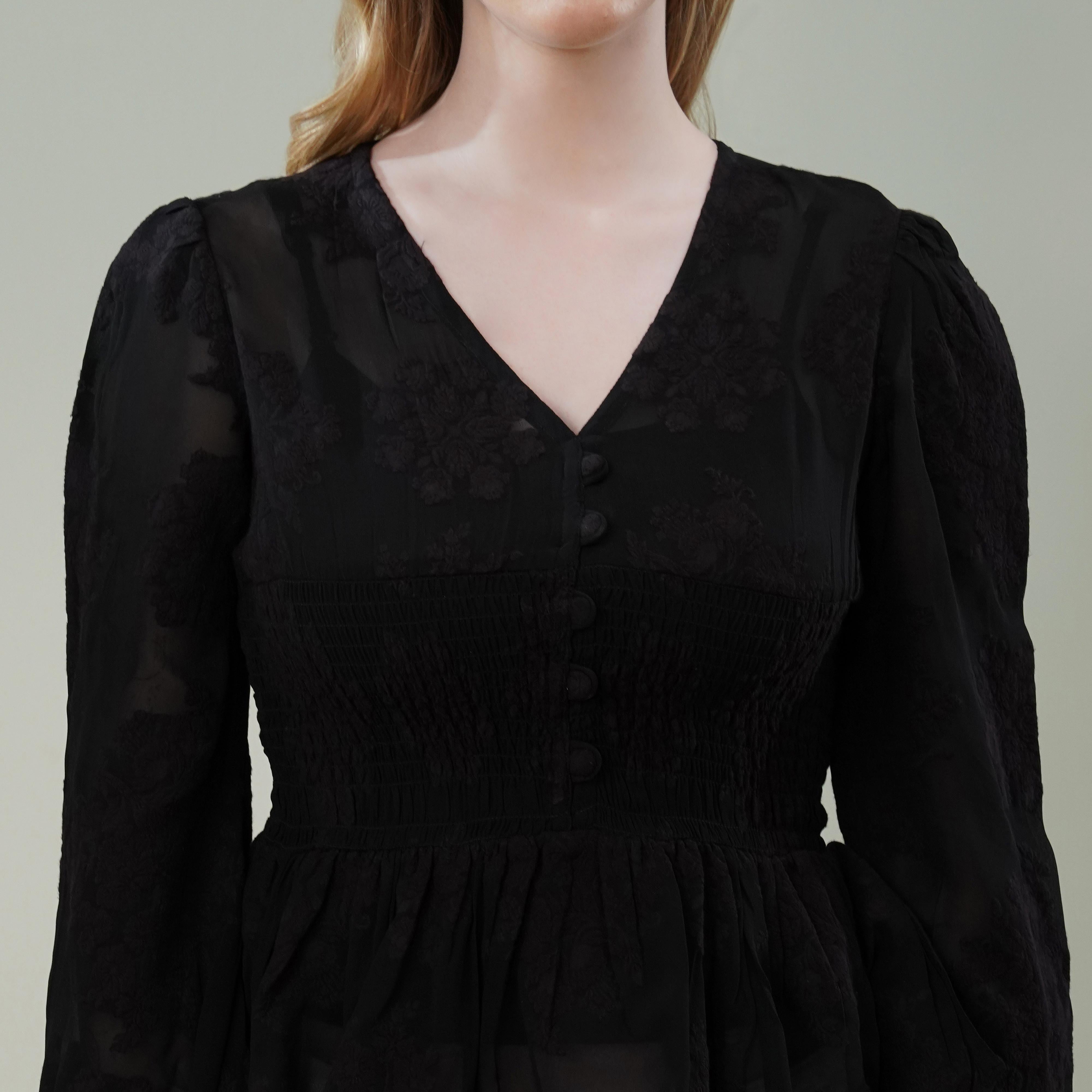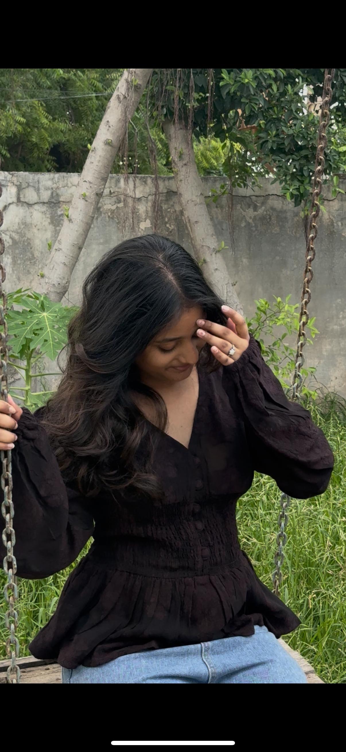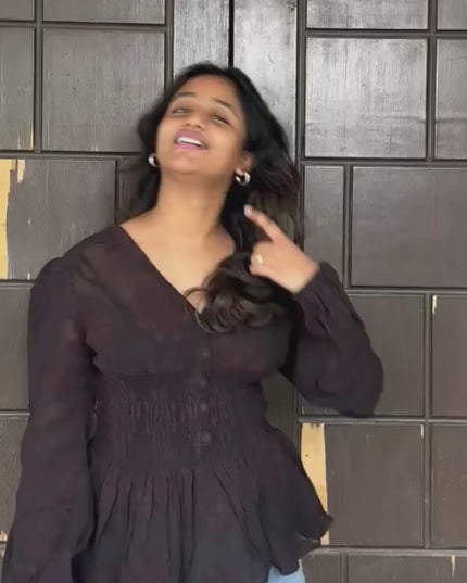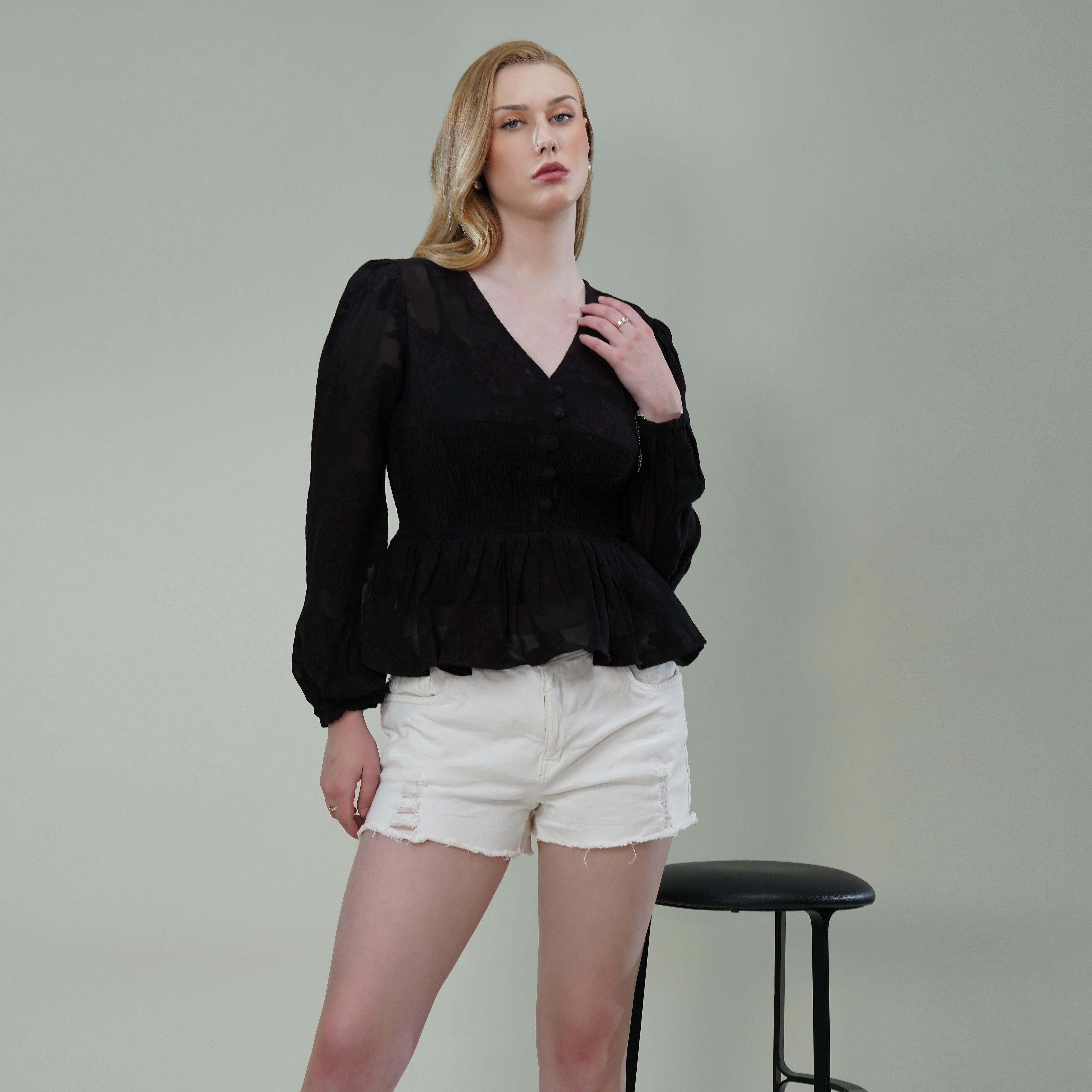 PRODUCT DETAILS SPECIFICATIONS Shape: Peplum fit Fit: Regular fit with a cinched waist Length: Hip-length Neck Pattern: V-neckline Sleeve Length: Full Sleeves Sleeve Style: Full-length puff sleeves with elastic cuffs Sheerness: Semi-sheer Pattern: Textured floral georgette top with a smocked waist, sheer puff sleeves, and a flowy peplum hem Material/Fabric: Textured Georgette Care Instructions: Hand wash in cold water with mild detergent, air dry in shade, and iron on low heat with a cloth over the lace Lining Requirement: Yes RECOMMENDATIONS Occasion: Suitable for evening wear, office wear or formal brunches Body Type: Ideal for hourglass and pear shapes Styling: Pair with high-waisted jeans or a sleek skirt and add statement earrings for a chic look SHIPPING AND RETURNS Β Shipping:We deliver across India withΒ free shipping on orders above βΉ1999.Standard shipping charges ofΒ βΉ50-βΉ100Β apply for orders below βΉ1999.Orders are processed withinΒ 1-2 business daysΒ and typically delivered inΒ 2-8 business days, depending on location.Track your order in real-time with the tracking details sent via email/SMS.πΒ Returns & Exchanges:Easy 7-day return policyΒ β return unworn, unwashed items in original packaging.Exchanges availableΒ based on stock availability.Full refund or replacementΒ for damaged or incorrect products (notify us withinΒ 48 hoursΒ of delivery).π¬Β Need Help?Β Contact our support atΒ contact@trumee.inΒ or callΒ +91-8882098526Β (Mon-Sat, 10 AM β 7 PM).