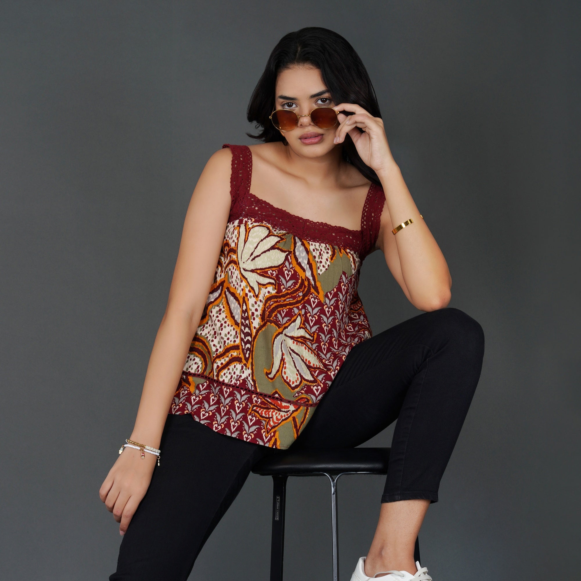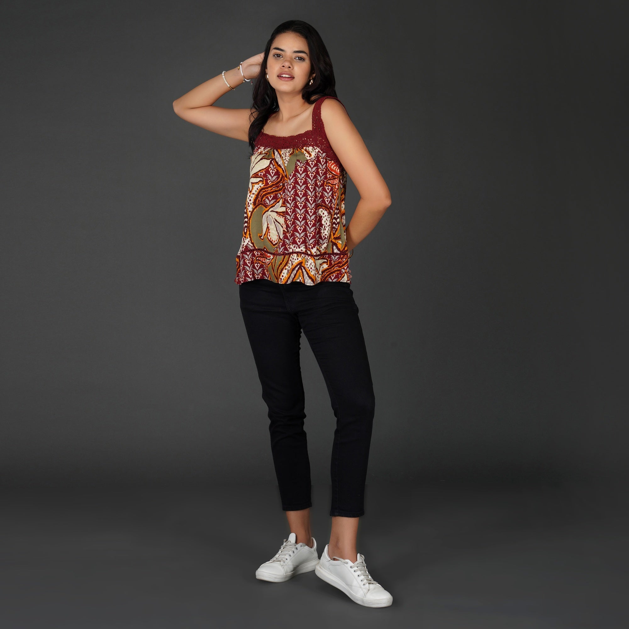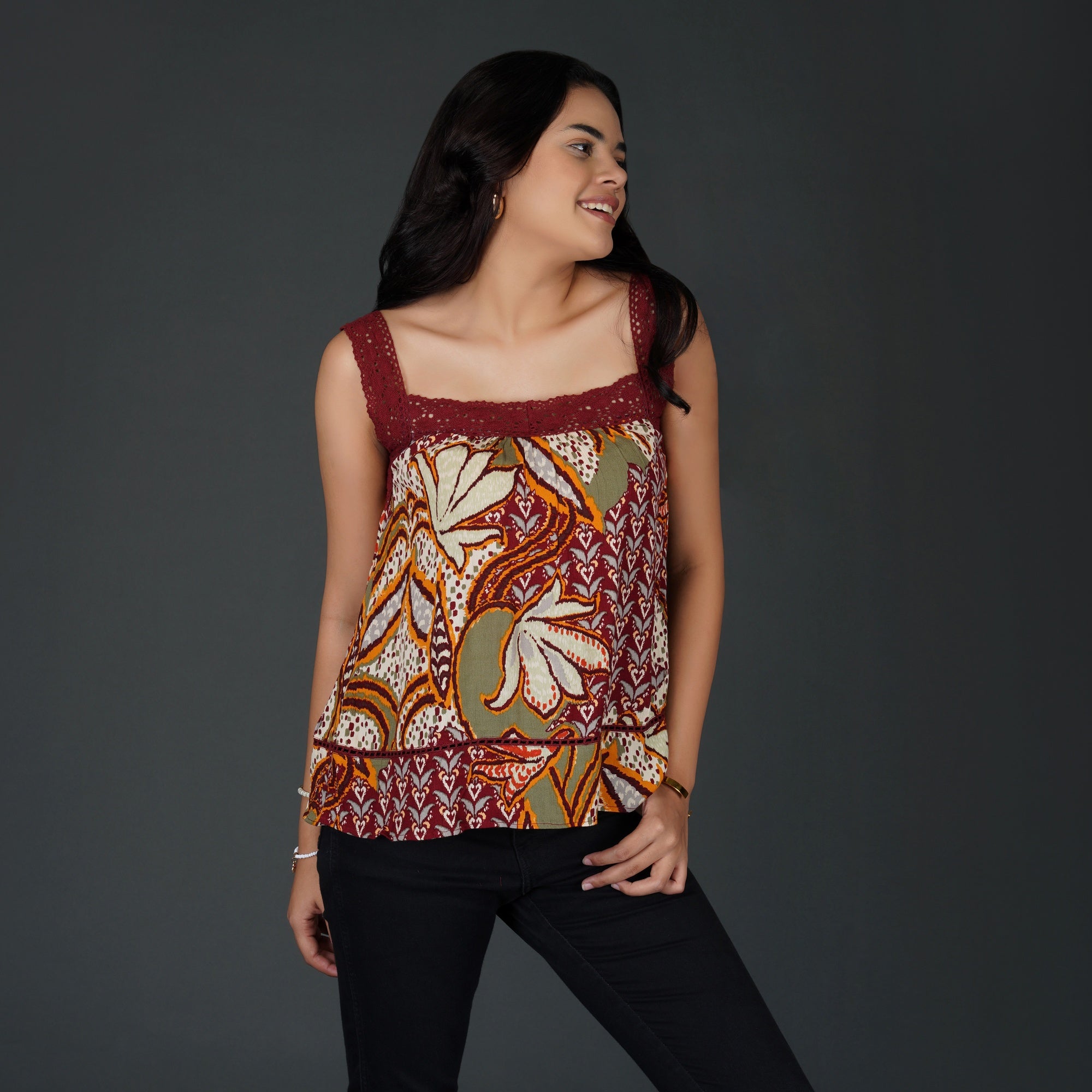 PRODUCT DETAILS SPECIFICATIONS Shape: A-line with a loose, flowy silhouette Fit: Relaxed Fit Length: Hip-length Neck Pattern: Square neckline with intricate lace accents Sleeve Length: Sleeveless Sleeve Style: Strap shoulders with crochet lace Sheerness: Completely Opaque Pattern: Features bold, earthy floral motifs blended with geometric patterns Material/Fabric: Rayon Crepe Care Instructions: Hand wash in cold water with mild detergent, air dry in shade, and iron on low heat with a cloth over the lace Lining Requirement: No RECOMMENDATIONS Occasion: Perfect for casual outings, brunch dates, or relaxed vacations Body Type: Suits all body types Styling: Pair this boho-chic square-neck top with high-waisted denim shorts SHIPPING AND RETURNS 📦 Shipping:We deliver across India with free shipping on orders above ₹1999.Standard shipping charges of ₹50-₹100 apply for orders below ₹1999.Orders are processed within 1-2 business days and typically delivered in 2-8 business days, depending on location.Track your order in real-time with the tracking details sent via email/SMS.🔄 Returns & Exchanges:Easy 7-day return policy – return unworn, unwashed items in original packaging.Exchanges available based on stock availability.Full refund or replacement for damaged or incorrect products (notify us within 48 hours of delivery).💬 Need Help? Contact our support at contact@trumee.in or call +91-8882098526 (Mon-Sat, 10 AM – 7 PM).