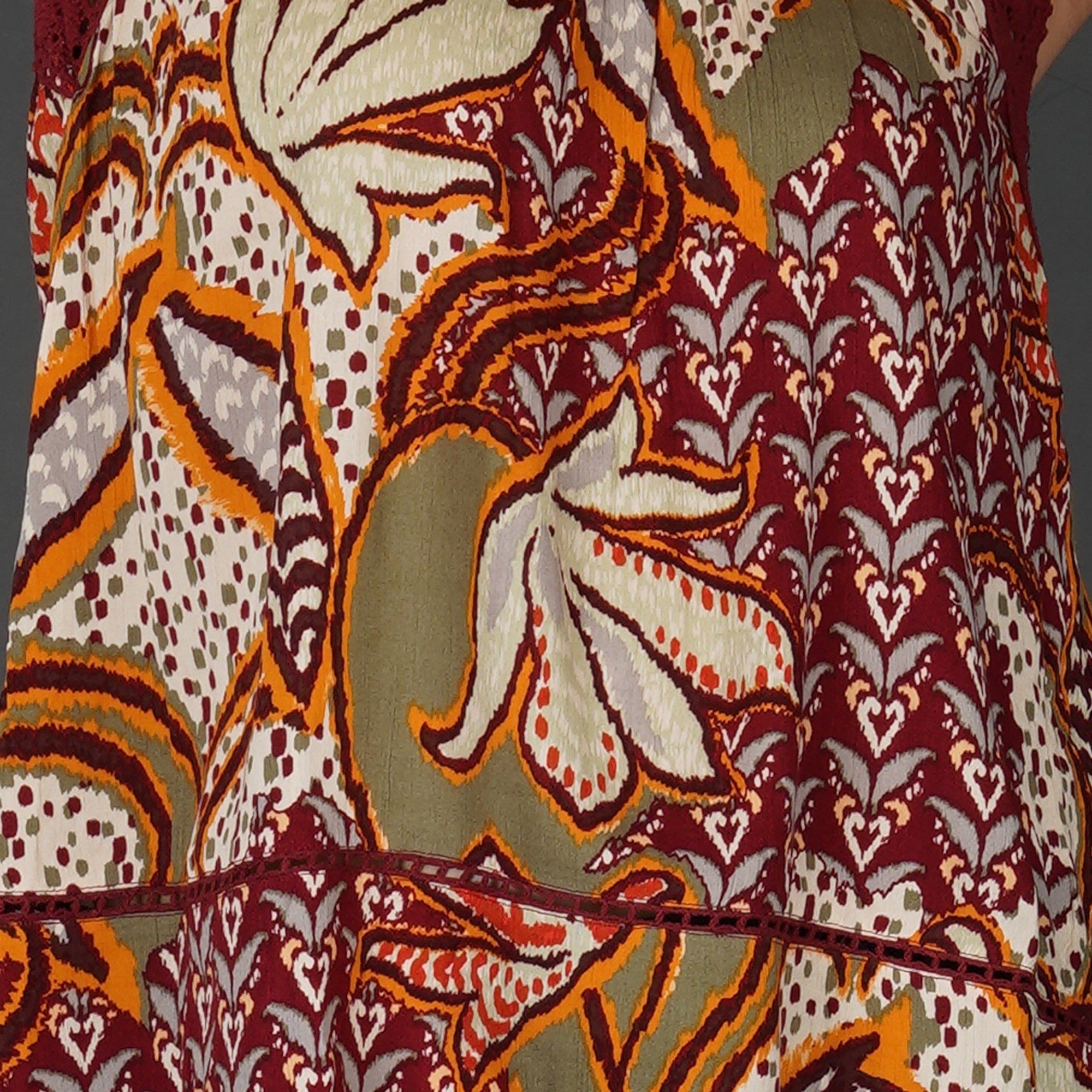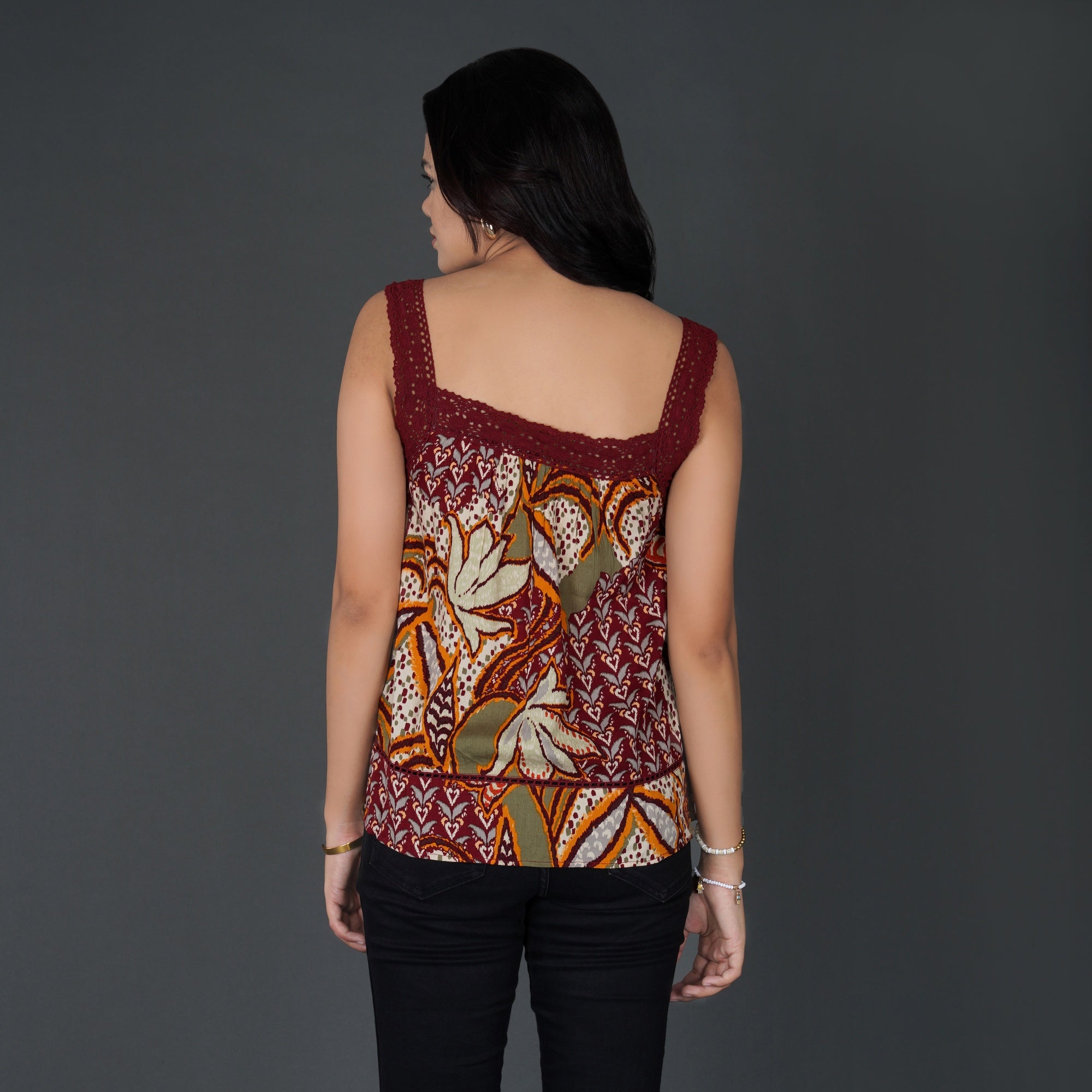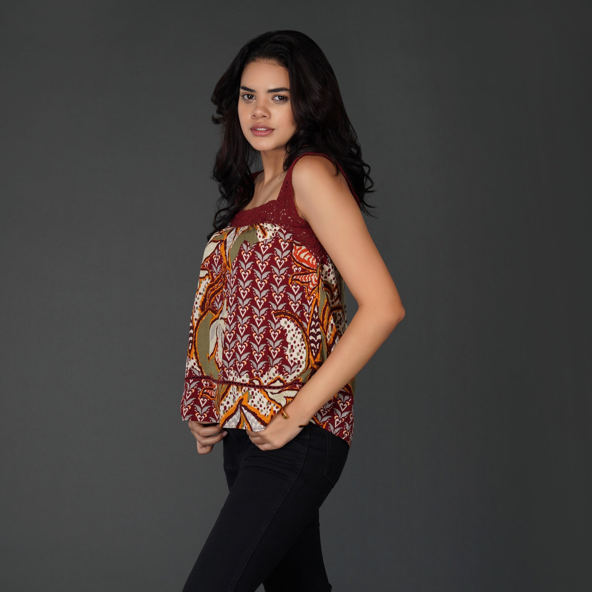PRODUCT DETAILS SPECIFICATIONS Shape: A-line with a loose, flowy silhouette Fit: Relaxed Fit Length: Hip-length Neck Pattern: Square neckline with intricate lace accents Sleeve Length: Sleeveless Sleeve Style: Strap shoulders with crochet lace Sheerness: Completely Opaque Pattern: Features bold, earthy floral motifs blended with geometric patterns Material/Fabric: Rayon Crepe Care Instructions: Hand wash in cold water with mild detergent, air dry in shade, and iron on low heat with a cloth over the lace Lining Requirement: No RECOMMENDATIONS Occasion: Perfect for casual outings, brunch dates, or relaxed vacations Body Type: Suits all body types Styling: Pair this boho-chic square-neck top with high-waisted denim shorts SHIPPING AND RETURNS 📦 Shipping:We deliver across India with free shipping on orders above ₹1999.Standard shipping charges of ₹50-₹100 apply for orders below ₹1999.Orders are processed within 1-2 business days and typically delivered in 2-8 business days, depending on location.Track your order in real-time with the tracking details sent via email/SMS.🔄 Returns & Exchanges:Easy 7-day return policy – return unworn, unwashed items in original packaging.Exchanges available based on stock availability.Full refund or replacement for damaged or incorrect products (notify us within 48 hours of delivery).💬 Need Help? Contact our support at contact@trumee.in or call +91-8882098526 (Mon-Sat, 10 AM – 7 PM).