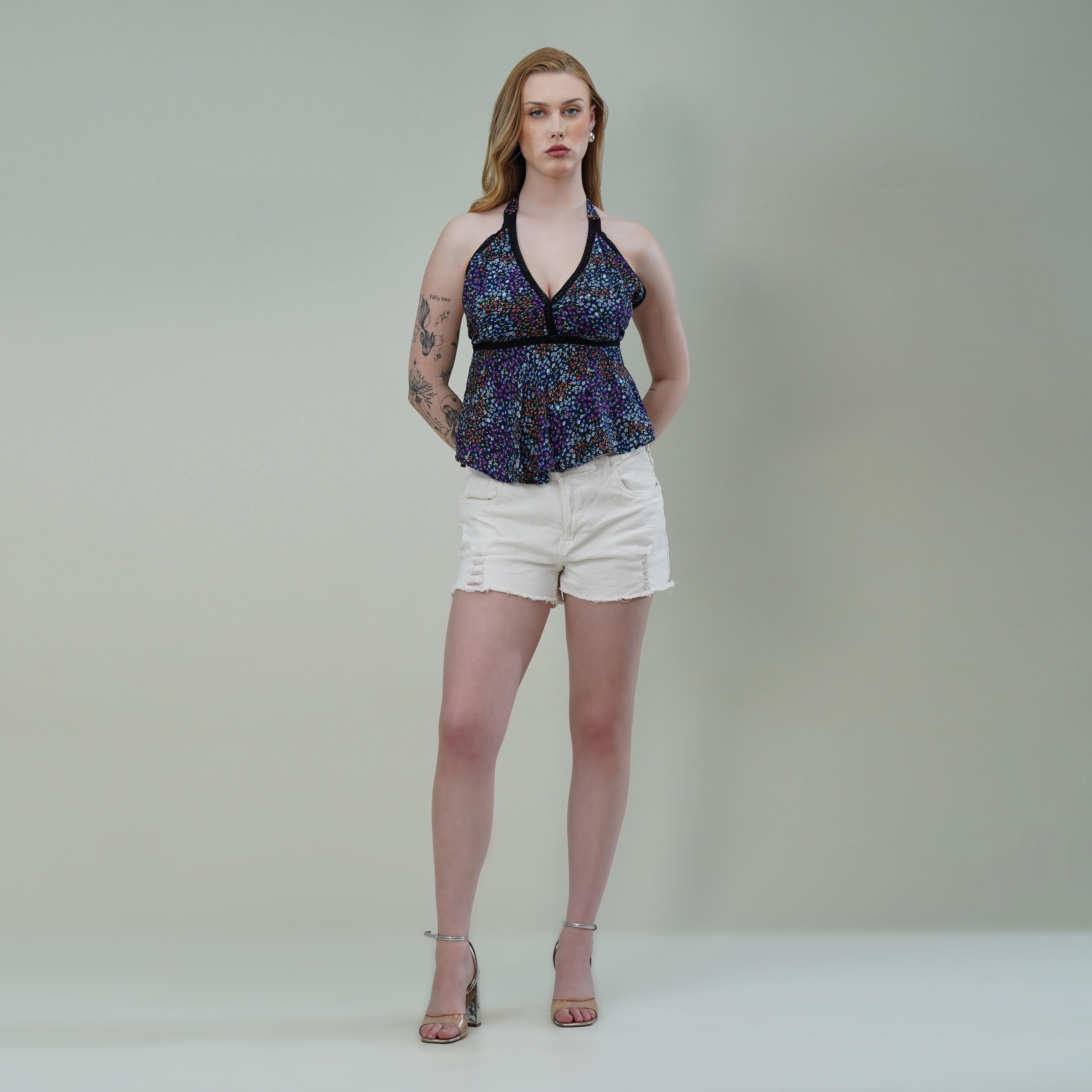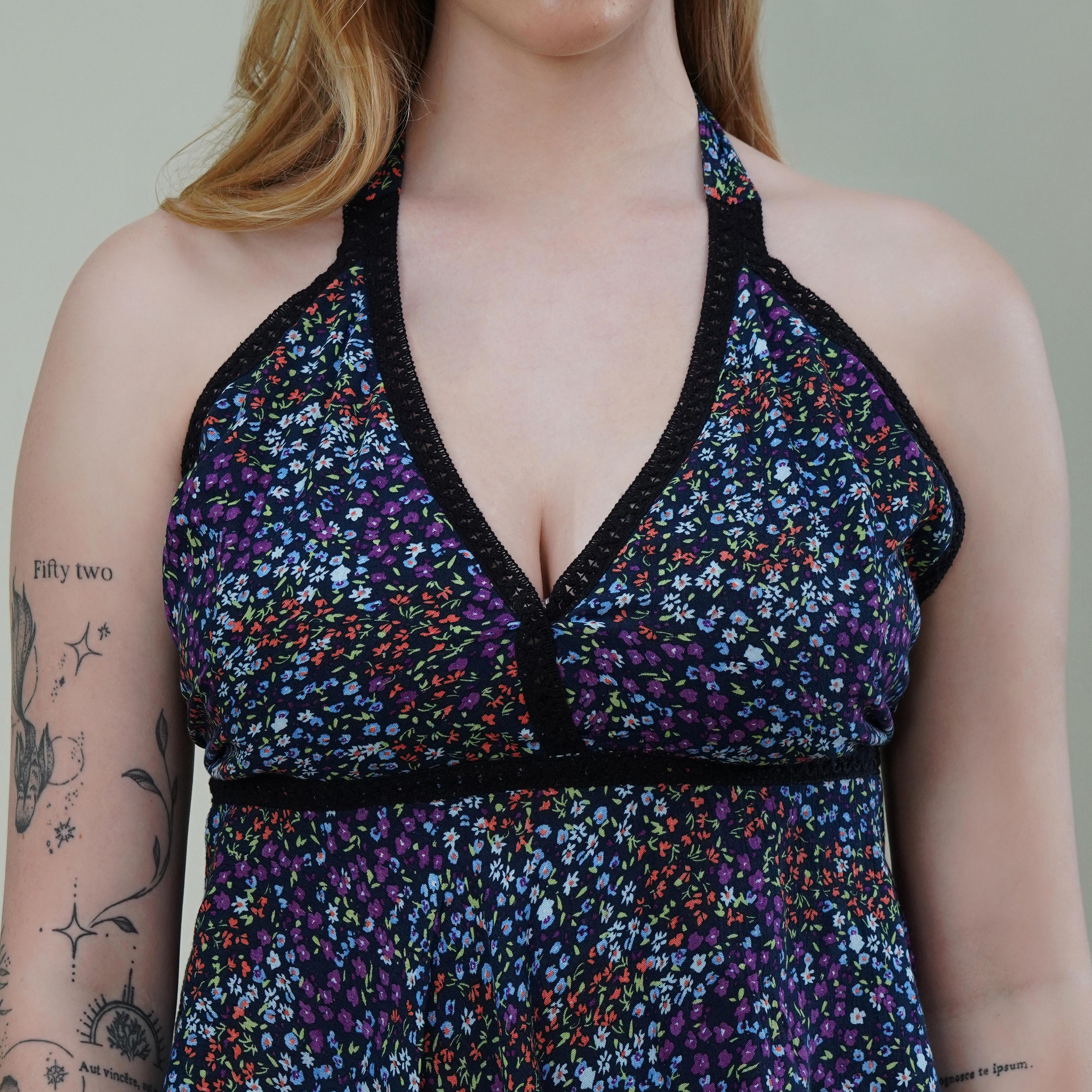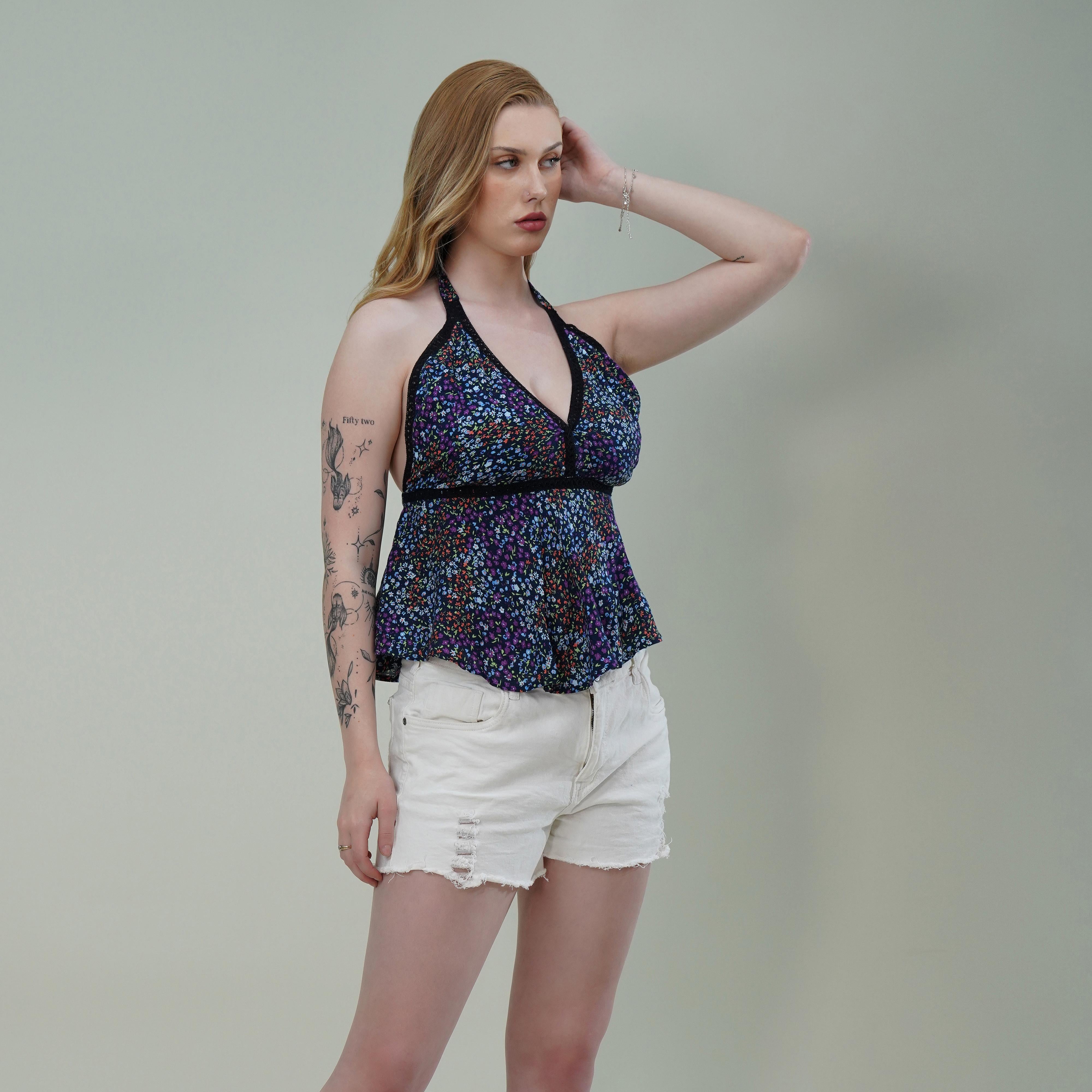 PRODUCT DETAILS SPECIFICATIONS Shape: Fitted bodice with a flared peplum hem Fit: Fit and flare Length: Hip-length Neck Pattern: Halter deep V neckline Sleeve Length: Sleeveless Sleeve Style: Halter-neck tie-up Sheerness: Completely Opaque Pattern: All-over ditsy floral print and laddernet lace Material/Fabric: Rayon Crepe, Cotton Crochet Lace Care Instructions: Hand wash in cold water with mild detergent, air dry in shade, and iron on low heat with a cloth over the lace Lining Requirement: No RECOMMENDATIONS Occasion: Ideal for casual outings, brunch, vacations, or relaxed evening events Body Type: Suits hourglass, rectangle, and pear shapes Styling: Pair it with high-waisted denim shorts and strappy sandals for a bohemian daytime look SHIPPING AND RETURNS Shipping:We deliver across India withย free shipping on orders above โน1999.Standard shipping charges ofย โน50-โน100ย apply for orders below โน1999.Orders are processed withinย 1-2 business daysย and typically delivered inย 2-8 business days, depending on location.Track your order in real-time with the tracking details sent via email/SMS.๐ย Returns & Exchanges:Easy 7-day return policyย โ return unworn, unwashed items in original packaging.Exchanges availableย based on stock availability.Full refund or replacementย for damaged or incorrect products (notify us withinย 48 hoursย of delivery).๐ฌย Need Help?ย Contact our support atย contact@trumee.inย or callย +91-8882098526ย (Mon-Sat, 10 AM โ 7 PM).