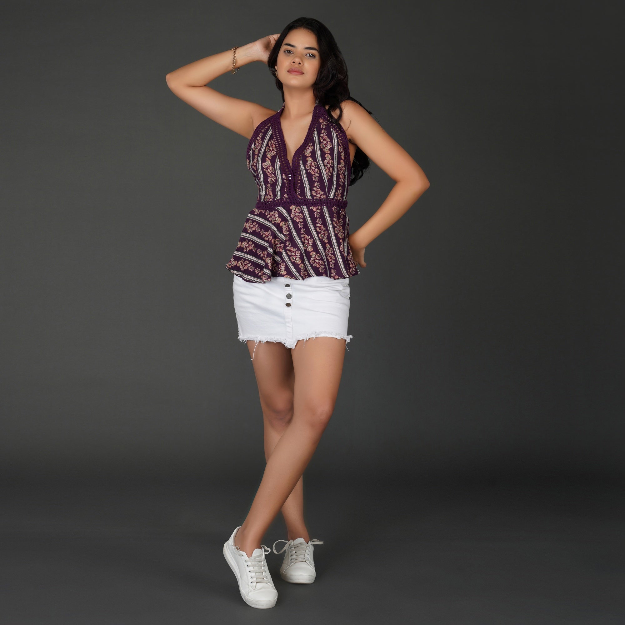 PRODUCT DETAILS SPECIFICATIONS Shape: Fitted bodice with a flared peplum hem Fit: Fit and flare Length: Hip-length Neck Pattern: Halter deep V neckline Sleeve Length: Sleeveless Sleeve Style: Halter-neck tie-up Sheerness: Completely Opaque Pattern: Floral and Striped Material/Fabric: Rayon Crepe, Cotton Crochet Lace Care Instructions: Hand wash in cold water with mild detergent, air dry in shade, and iron on low heat with a cloth over the lace Lining Requirement: No RECOMMENDATIONS Occasion: Ideal for casual outings, brunch, vacations, or relaxed evening events Body Type: Suits hourglass, rectangle, and pear shapes Styling: Pair it with high-waisted denim shorts and strappy sandals for a bohemian daytime look SHIPPING AND RETURNS Shipping:We deliver across India with free shipping on orders above ₹1999.Standard shipping charges of ₹50-₹100 apply for orders below ₹1999.Orders are processed within 1-2 business days and typically delivered in 2-8 business days, depending on location.Track your order in real-time with the tracking details sent via email/SMS.🔄 Returns & Exchanges:Easy 7-day return policy – return unworn, unwashed items in original packaging.Exchanges available based on stock availability.Full refund or replacement for damaged or incorrect products (notify us within 48 hours of delivery).💬 Need Help? Contact our support at contact@trumee.in or call +91-8882098526 (Mon-Sat, 10 AM – 7 PM).