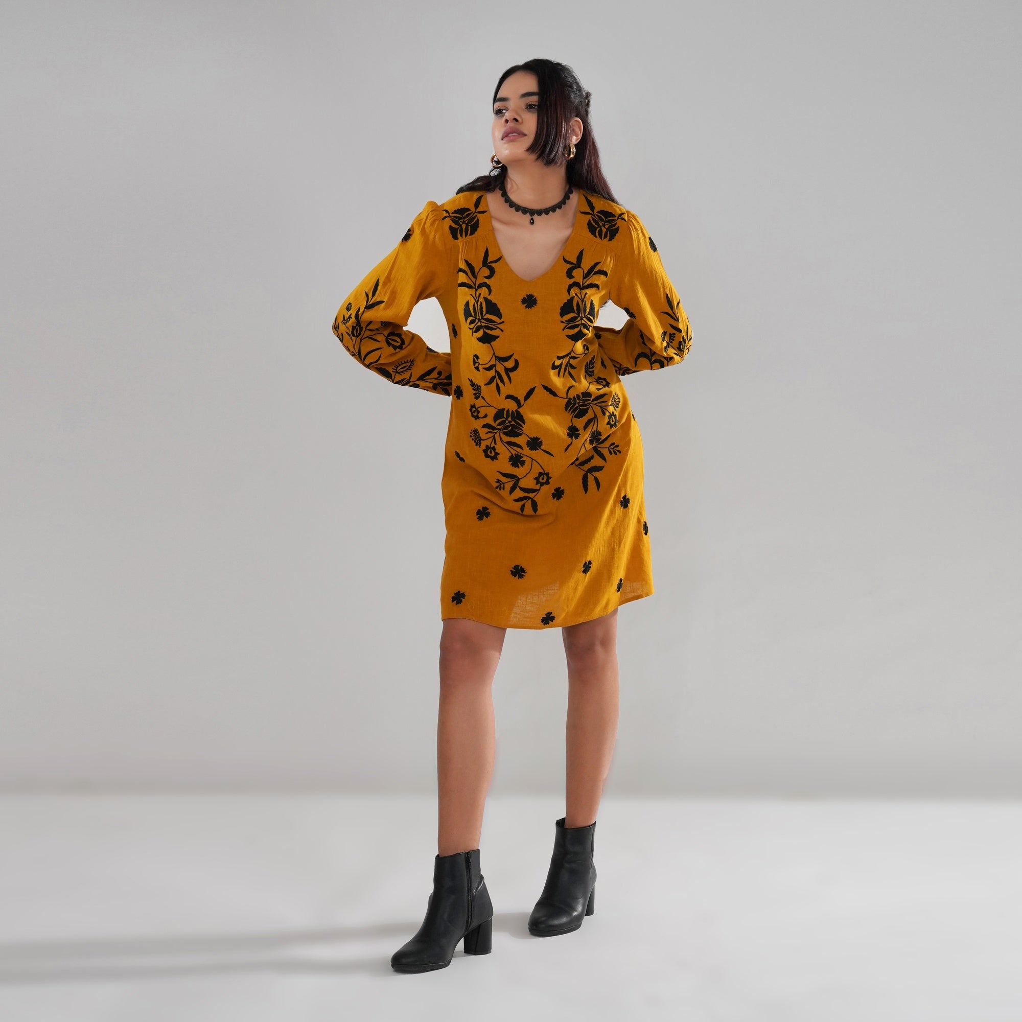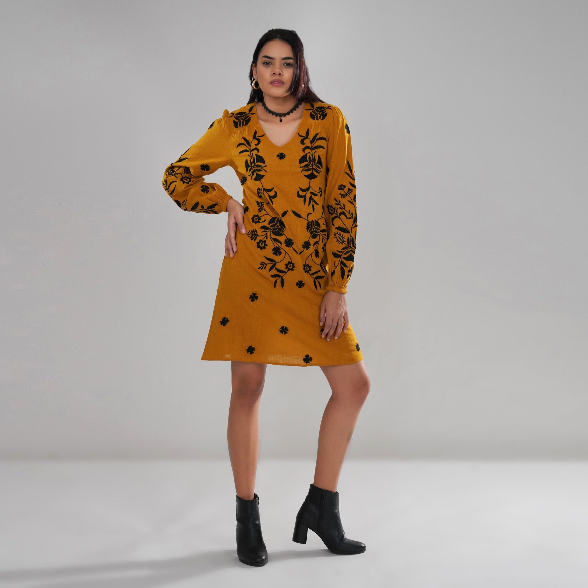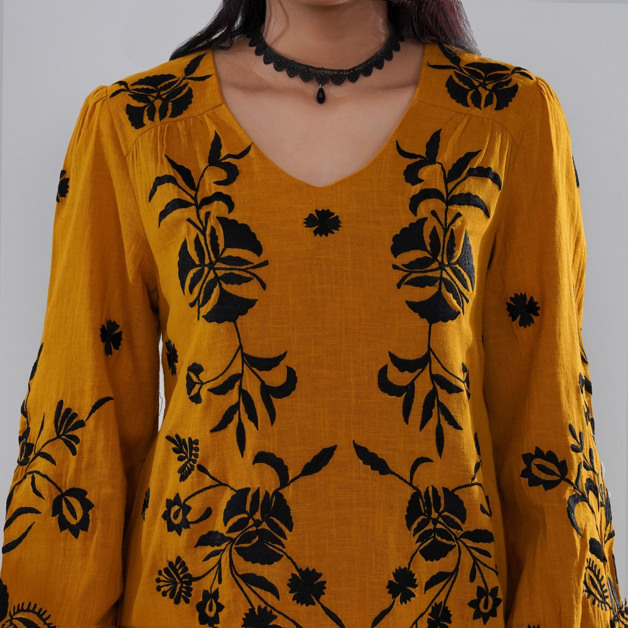 Styling: Pair with black ankle boots for a bold look or strappy sandals for a softer vibe. Add statement earrings or a black choker to complement the embroidery