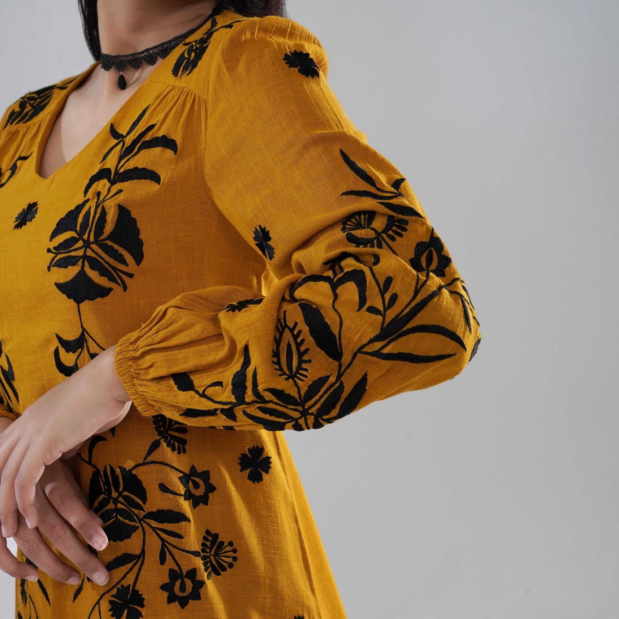 Sleeve Style: Long bishop sleeves with gathered cuffs and bold floral embroidery
