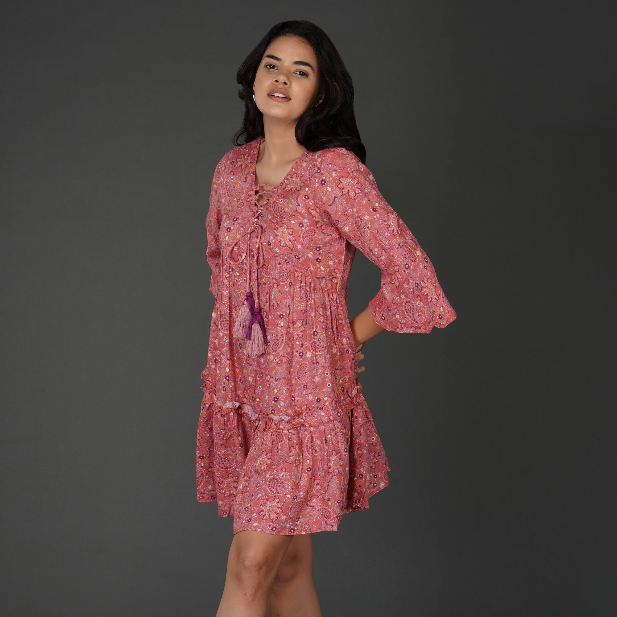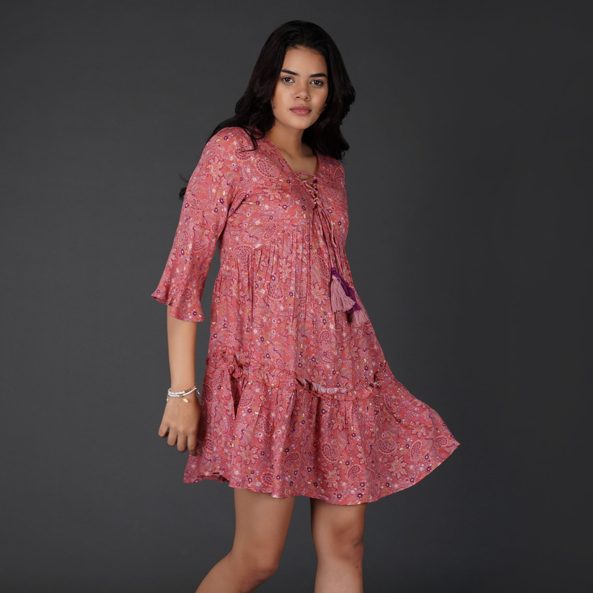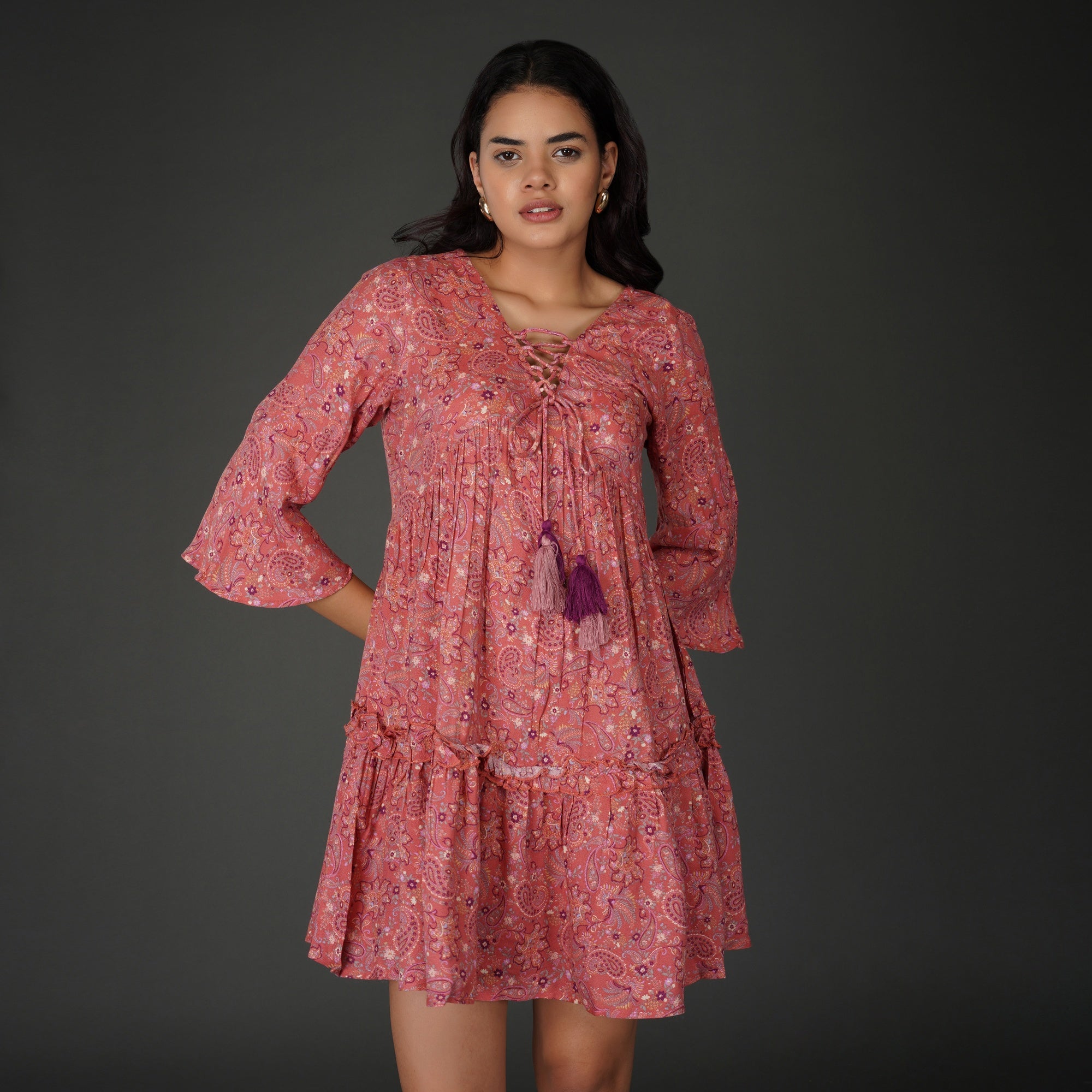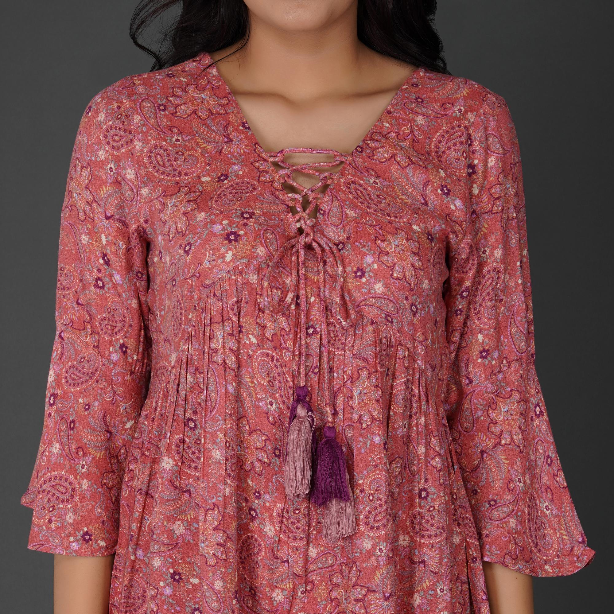 PRODUCT DETAILS SPECIFICATIONS Shape: Relaxed A-line with a tiered structure Fit: Relaxed Fit Length: Mini Neck Pattern: V-neckline with lace-up tassel details Sleeve Length: Three-Quarter Sleeves Sleeve Style: Bell Sleeves Sheerness: Completely Opaque Pattern: Paisley and floral motifs Material/Fabric: Cotton Moss Care Instructions: Hand wash it in cold water and line dry it Lining Requirement: No RECOMMENDATIONS Occasion: Ideal for casual gatherings, vacations Body Type: Suitable for pear, apple, and hourglass body shapes Styling: Pair with ankle boots or flat sandals for a bohemian vibe. Add a crossbody bag and statement earrings to complete the look SHIPPING AND RETURNS ๐ฆย Shipping:We deliver across India withย free shipping on orders above โน1999.Standard shipping charges ofย โน50-โน100ย apply for orders below โน1999.Orders are processed withinย 1-2 business daysย and typically delivered inย 2-8 business days, depending on location.Track your order in real-time with the tracking details sent via email/SMS.๐ย Returns & Exchanges:Easy 7-day return policyย โ return unworn, unwashed items in original packaging.Exchanges availableย based on stock availability.Full refund or replacementย for damaged or incorrect products (notify us withinย 48 hoursย of delivery).๐ฌย Need Help?ย Contact our support atย contact@trumee.inย or callย +91-8882098526ย (Mon-Sat, 10 AM โ 7 PM).