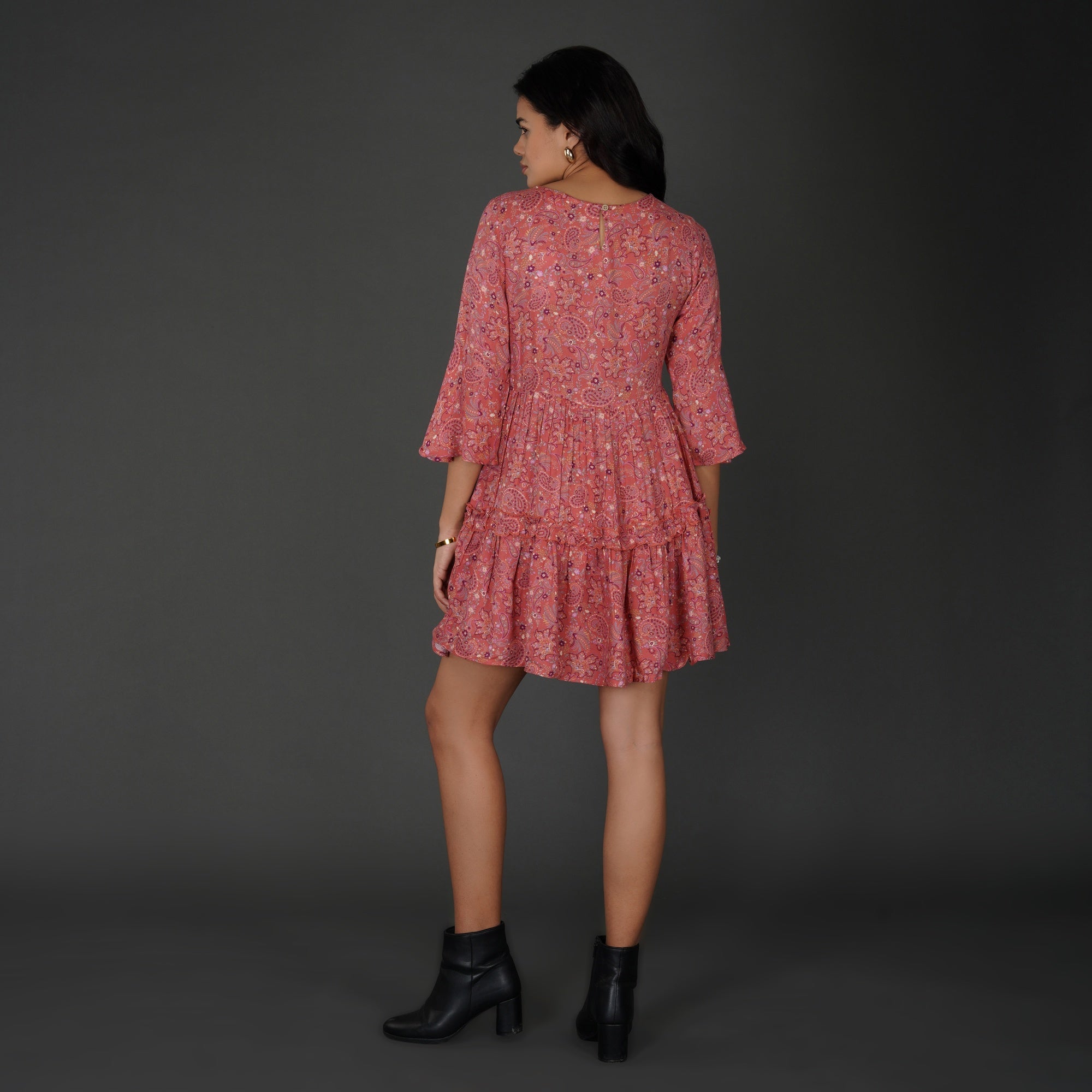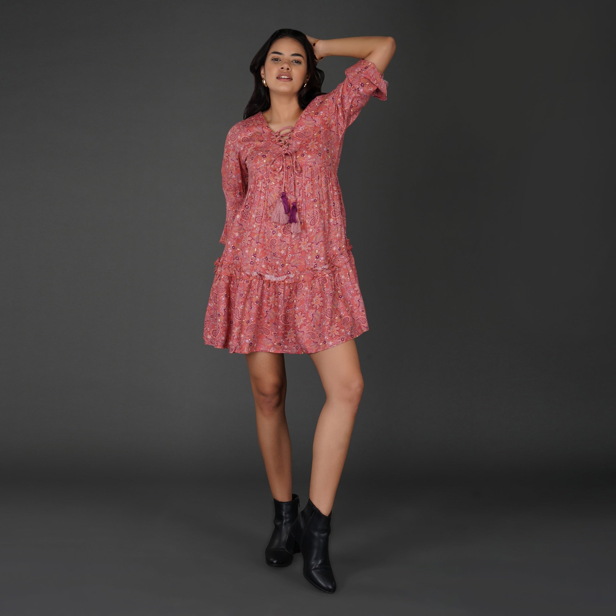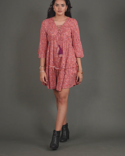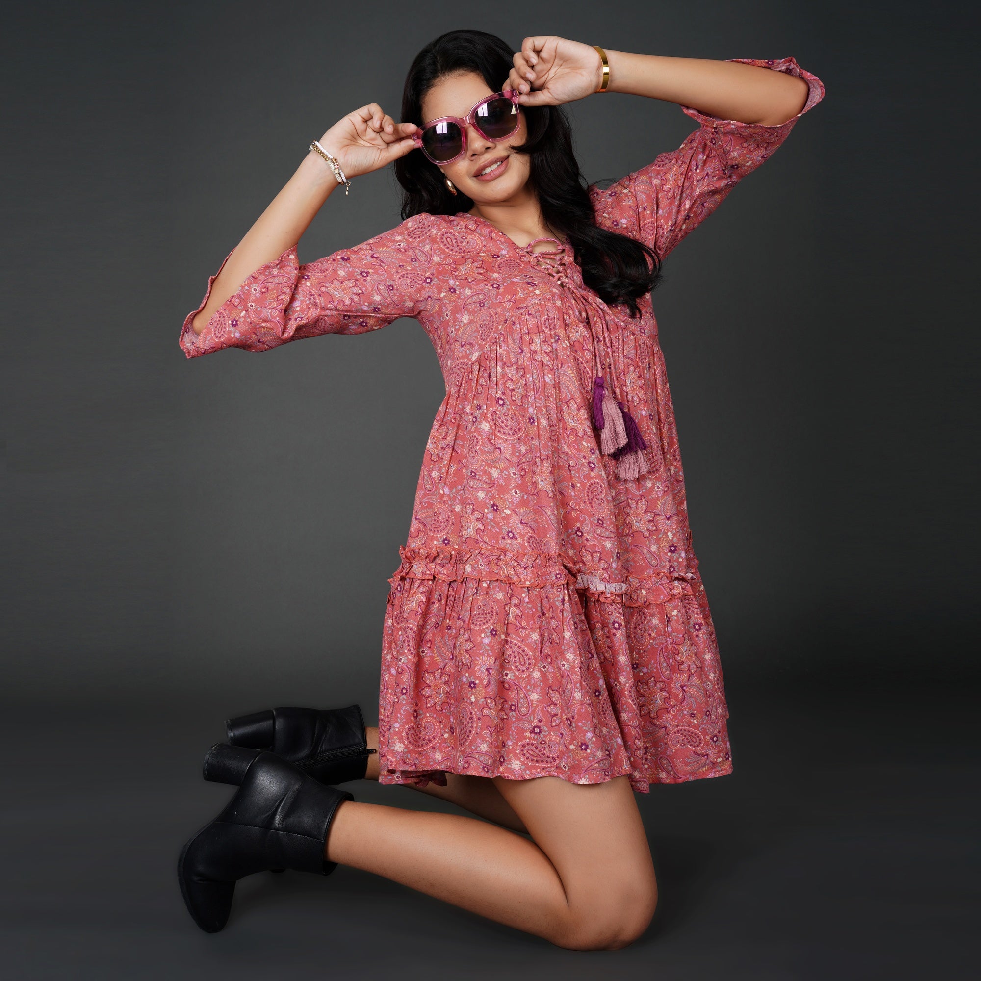 PRODUCT DETAILS SPECIFICATIONS Shape: Relaxed A-line with a tiered structure Fit: Relaxed Fit Length: Mini Neck Pattern: V-neckline with lace-up tassel details Sleeve Length: Three-Quarter Sleeves Sleeve Style: Bell Sleeves Sheerness: Completely Opaque Pattern: Paisley and floral motifs Material/Fabric: Cotton Moss Care Instructions: Hand wash it in cold water and line dry it Lining Requirement: No RECOMMENDATIONS Occasion: Ideal for casual gatherings, vacations Body Type: Suitable for pear, apple, and hourglass body shapes Styling: Pair with ankle boots or flat sandals for a bohemian vibe. Add a crossbody bag and statement earrings to complete the look SHIPPING AND RETURNS ๐ฆย Shipping:We deliver across India withย free shipping on orders above โน1999.Standard shipping charges ofย โน50-โน100ย apply for orders below โน1999.Orders are processed withinย 1-2 business daysย and typically delivered inย 2-8 business days, depending on location.Track your order in real-time with the tracking details sent via email/SMS.๐ย Returns & Exchanges:Easy 7-day return policyย โ return unworn, unwashed items in original packaging.Exchanges availableย based on stock availability.Full refund or replacementย for damaged or incorrect products (notify us withinย 48 hoursย of delivery).๐ฌย Need Help?ย Contact our support atย contact@trumee.inย or callย +91-8882098526ย (Mon-Sat, 10 AM โ 7 PM).