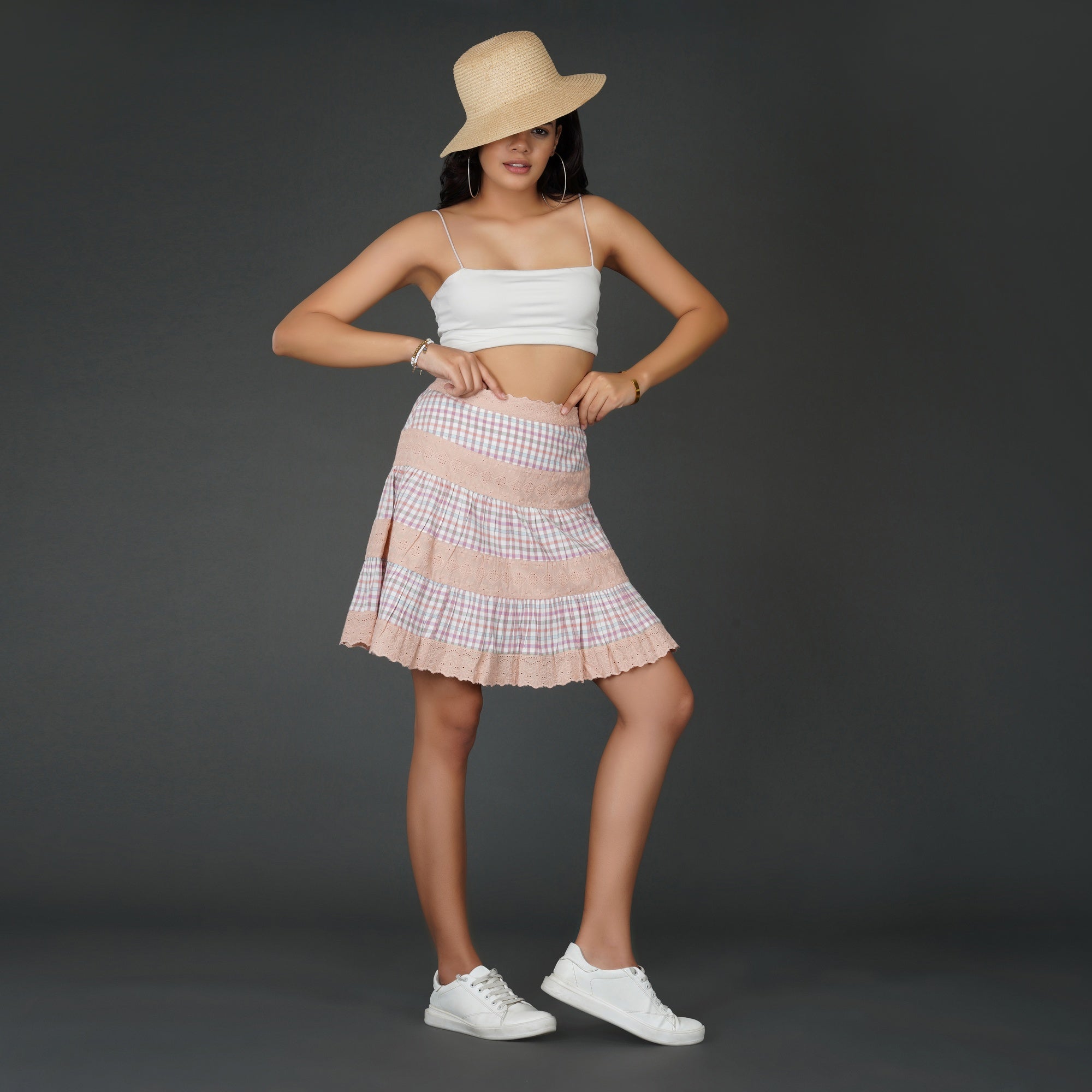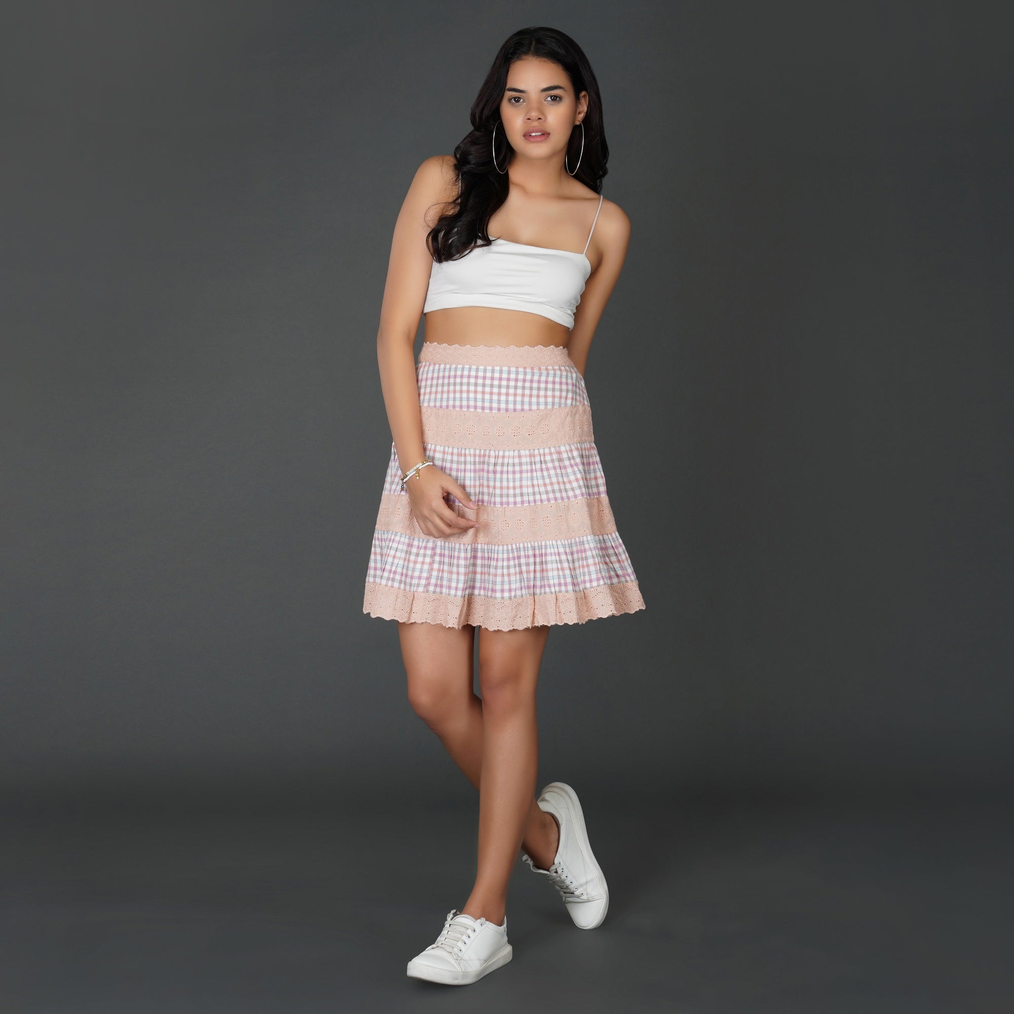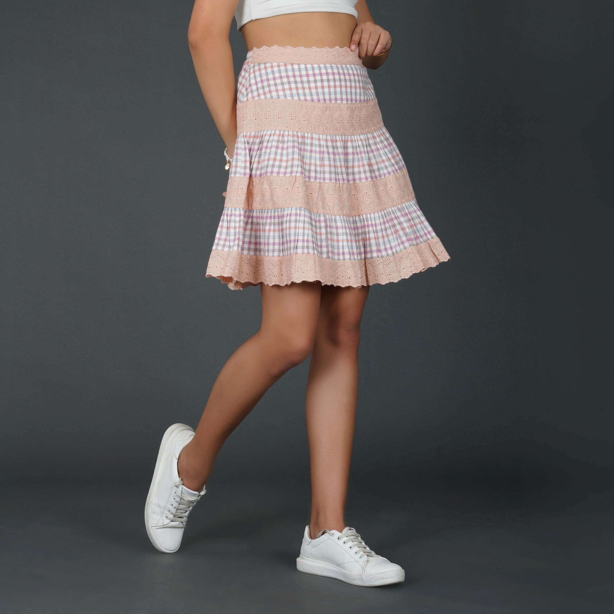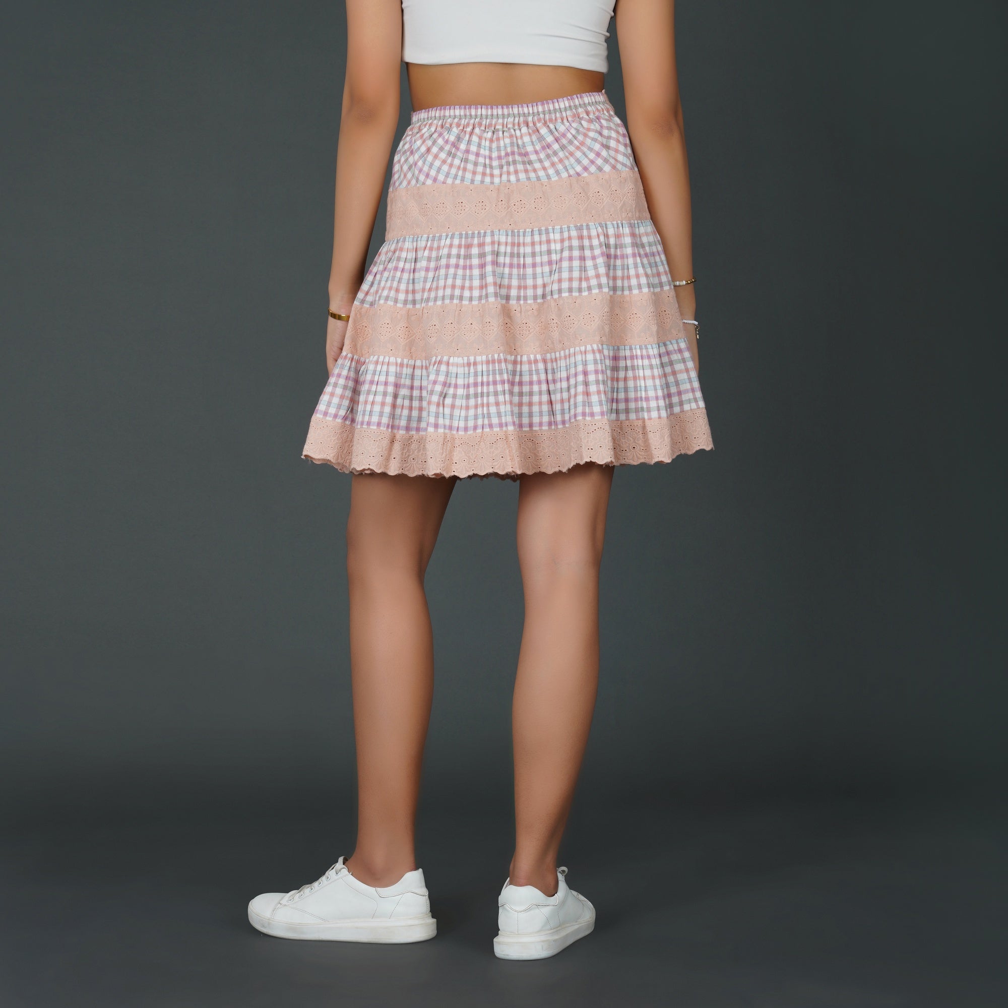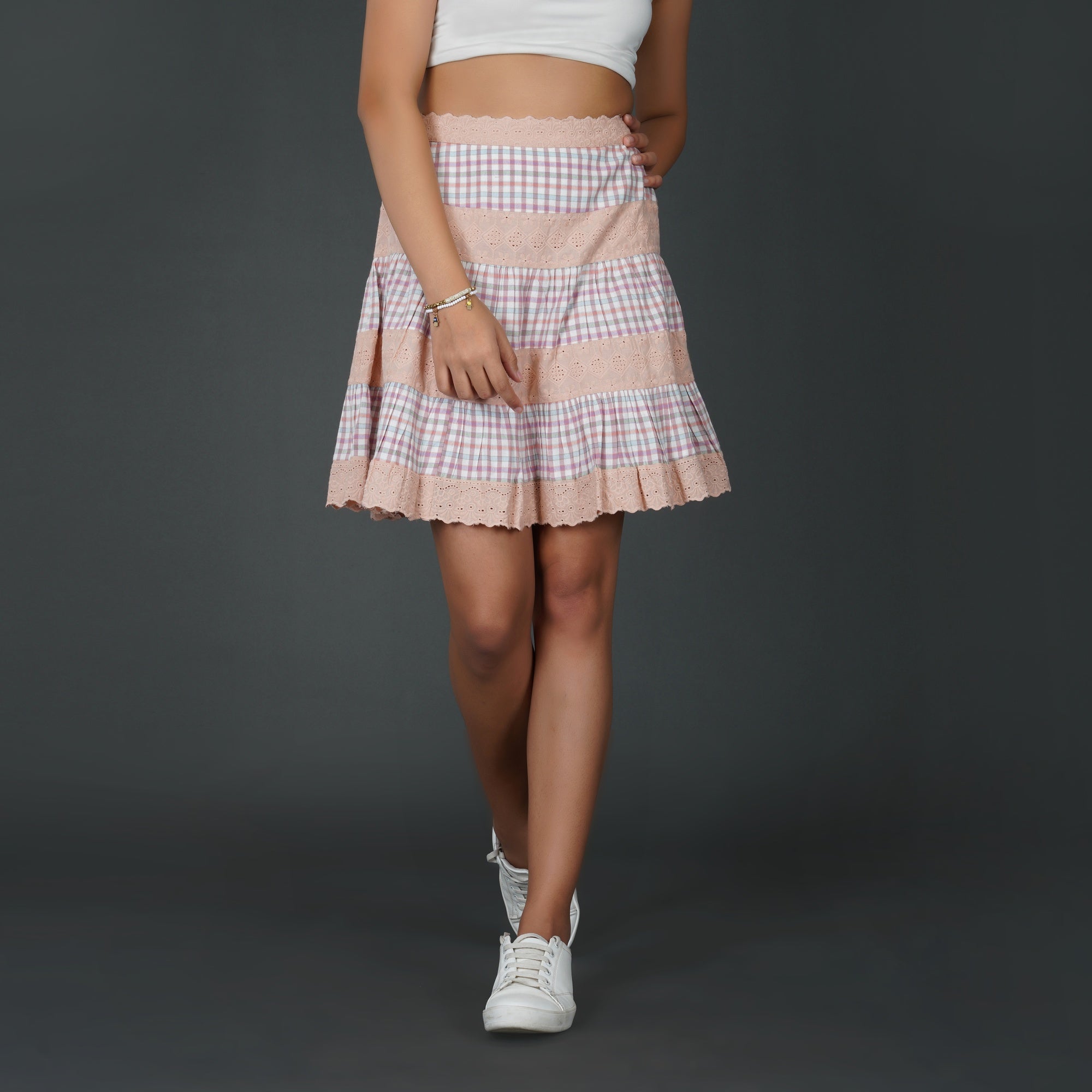 PRODUCT DETAILS SPECIFICATIONS Shape: Tiered A-line silhouette Fit: Relaxed Fit Length: Above Knee Sheerness: Completely Opaque Pattern: Checkered pattern paired with floral schiffli lace Material/Fabric: Cotton check and schiffli Care Instructions: Hand wash in cold water with mild detergent, air dry in shade, and iron on low heat with a cloth over the lace Lining Requirement: No RECOMMENDATIONS Occasion: Ideal for brunches, summer outings, and daytime events Body Type: Suits all body types Styling: Pair this skirt with a fitted crop top or a breezy blouse SHIPPING AND RETURNS 📦 Shipping:We deliver across India with free shipping on orders above ₹1999.Standard shipping charges of ₹50-₹100 apply for orders below ₹1999.Orders are processed within 1-2 business days and typically delivered in 2-8 business days, depending on location.Track your order in real-time with the tracking details sent via email/SMS.🔄 Returns & Exchanges:Easy 7-day return policy – return unworn, unwashed items in original packaging.Exchanges available based on stock availability.Full refund or replacement for damaged or incorrect products (notify us within 48 hours of delivery).💬 Need Help? Contact our support at contact@trumee.in or call +91-8882098526 (Mon-Sat, 10 AM – 7 PM).