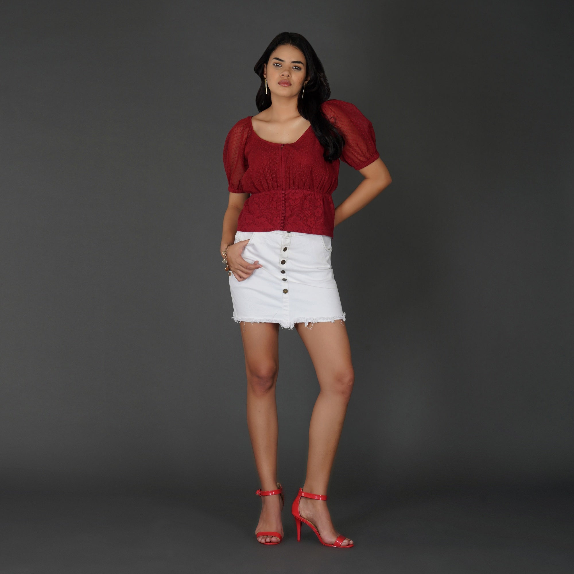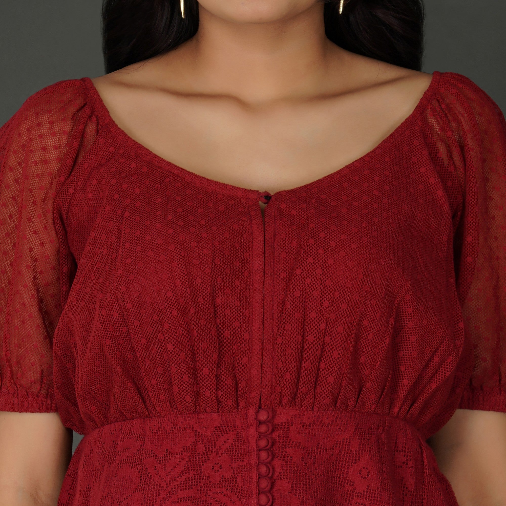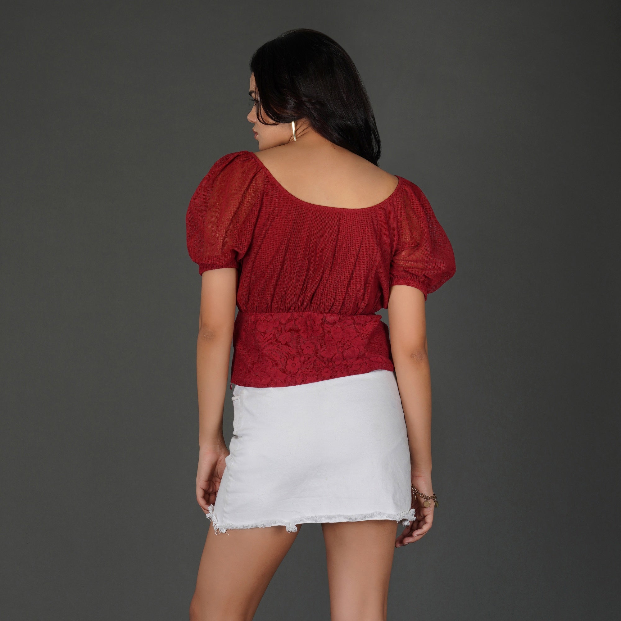 PRODUCT DETAILS SPECIFICATIONS Shape: Fitted Waist Panel Top Fit: Tailored fit at the waist with a flared peplum Length: Mini Neck Pattern: Classic round neckline with a front keyhole button detail Sleeve Length: Half-sleeves Sleeve Style: Sheer puff sleeves with elasticated hems Sheerness: Opaque Pattern: Floral lace pattern on a textured cotton Material/Fabric: Cotton Lace Care Instructions: Hand wash in cold water with mild detergent, air dry in shade, and iron on low heat with a cloth over the lace Lining Requirement: No RECOMMENDATIONS Occasion: Ideal for brunches, date nights, and semi-formal gatherings Body Type: Flattering for hourglass and pear shapes due to its defined waistline Styling: Pair with a white denim skirt and heels for a chic day look or skinny jeans and statement earrings for an evening outing SHIPPING AND RETURNS Shipping:We deliver across India with free shipping on orders above ₹1999.Standard shipping charges of ₹50-₹100 apply for orders below ₹1999.Orders are processed within 1-2 business days and typically delivered in 2-8 business days, depending on location.Track your order in real-time with the tracking details sent via email/SMS.🔄 Returns & Exchanges:Easy 7-day return policy – return unworn, unwashed items in original packaging.Exchanges available based on stock availability.Full refund or replacement for damaged or incorrect products (notify us within 48 hours of delivery).💬 Need Help? Contact our support at contact@trumee.in or call +91-8882098526 (Mon-Sat, 10 AM – 7 PM).
