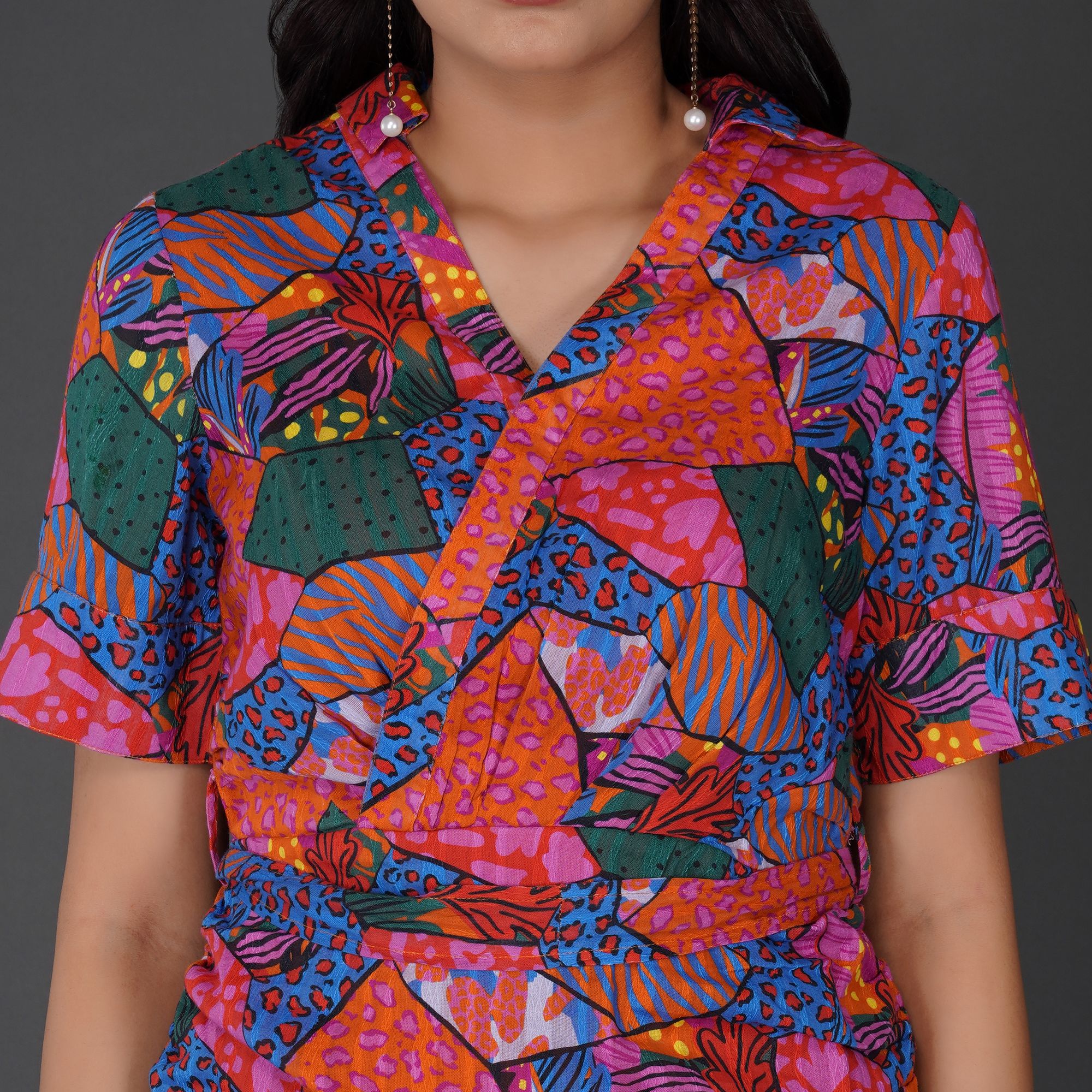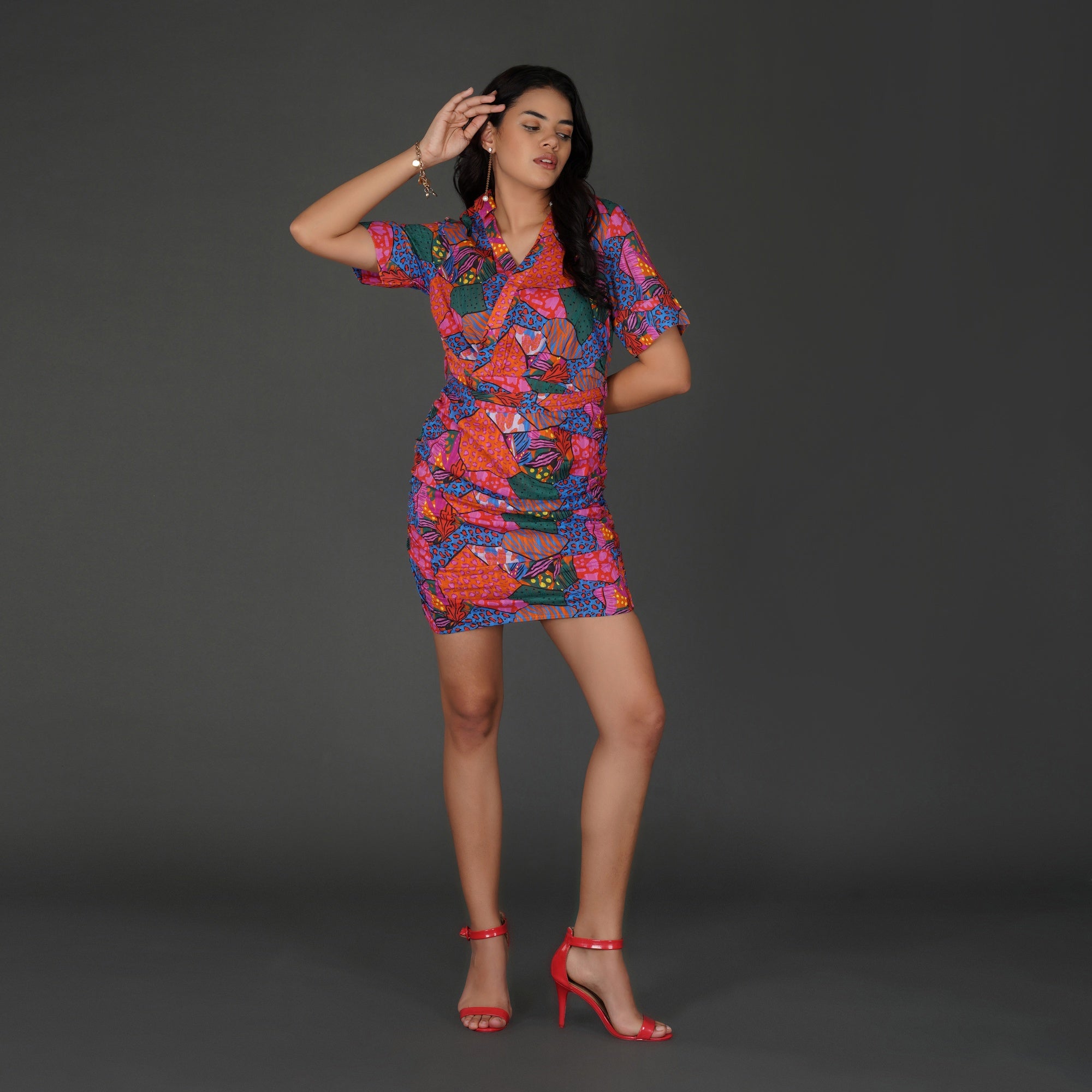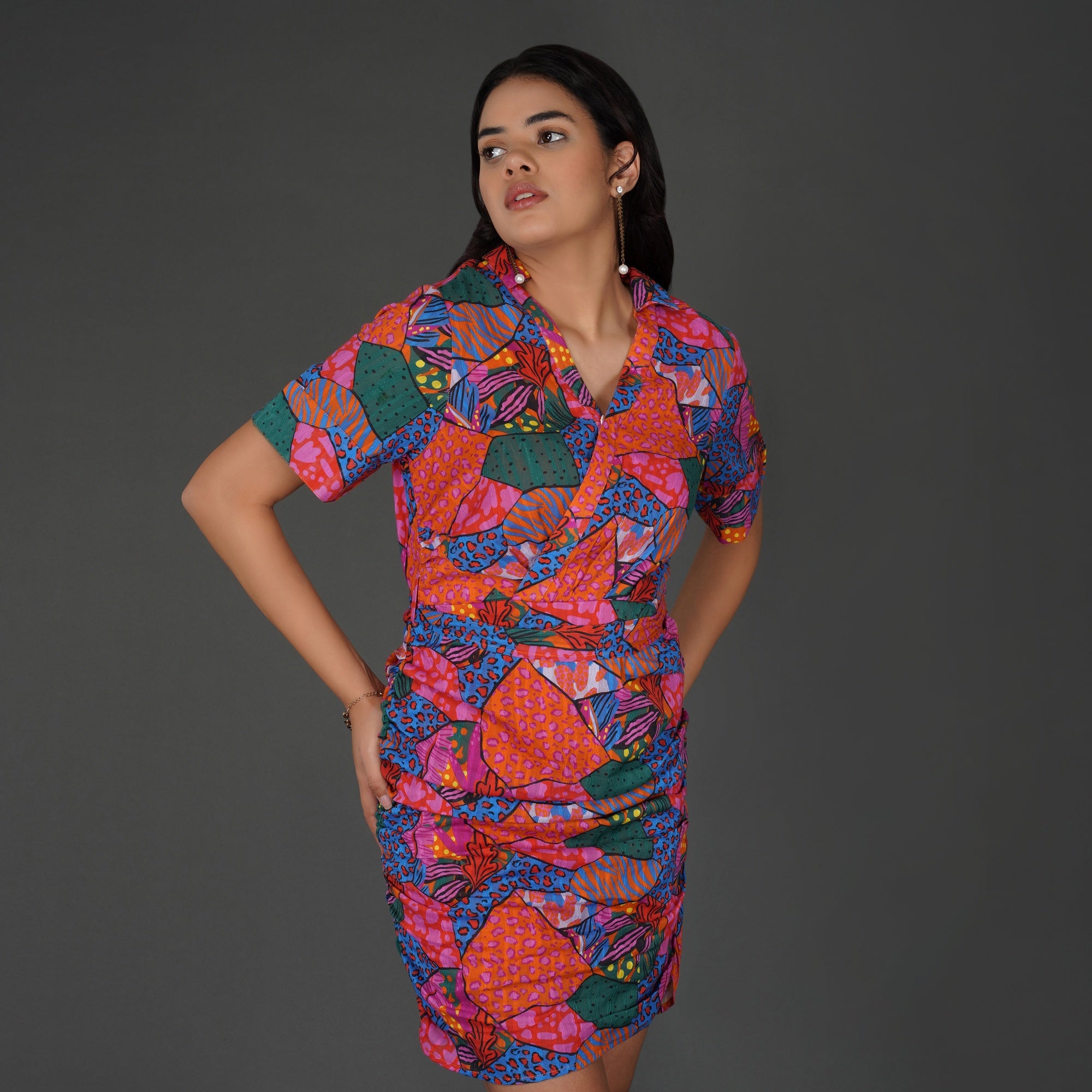 PRODUCT DETAILS SPECIFICATIONS Shape: Slim-fit contour Fit: Wrap-style bodice with an overlapping neckline, while the bottom half is slim-fitting with gathered sides Length: Mini Neck Pattern: V-neckline with collar Sleeve Length: Short Sleeve Style: Structured short sleeves Sheerness: Completely Opaque Pattern: Abstract Material/Fabric: Textured cotton Care Instructions: Hand wash in cold water or on a gentle cycle. Lay flat or hang in shade to dry Lining Requirement: No RECOMMENDATIONS Occasion: Perfect for cocktail parties, casual gatherings, brunches, or date nights Body Type: Flattering for hourglass, pear, and rectangle body shapes Styling: Pair this vibrant dress with white sneakers for a casual day look or dress it up with strappy heels and bold earrings for an evening out SHIPPING AND RETURNS 📦 Shipping:We deliver across India with free shipping on orders above ₹1999.Standard shipping charges of ₹50-₹100 apply for orders below ₹1999.Orders are processed within 1-2 business days and typically delivered in 2-8 business days, depending on location.Track your order in real-time with the tracking details sent via email/SMS.🔄 Returns & Exchanges:Easy 7-day return policy – return unworn, unwashed items in original packaging.Exchanges available based on stock availability.Full refund or replacement for damaged or incorrect products (notify us within 48 hours of delivery).💬 Need Help? Contact our support at contact@trumee.in or call +91-8882098526 (Mon-Sat, 10 AM – 7 PM).
